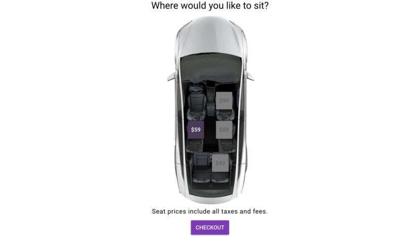 The next step was to select my seat. There are 4 seats available on any Tesloop — one in the first row, two in the second and one in the third. In this case, the only seat left was the one right behind the driver, but had it been available, I could have saved $10 by booking the seat in the third row.