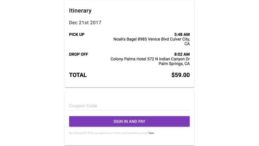 I was then presented with all of the trips leaving my area that day — including ones that were fully booked. There were rides departing as early as 5:48am and as late as 11:11pm. However, since I was making my booking the night before departure, my options were limited. There was only one trip left with an open seat and, unsurprisingly, it was the one leaving at 5:48am. I'm typically not a morning person, but I figured that it would give me the full day in Palm Springs so I proceeded with the booking.