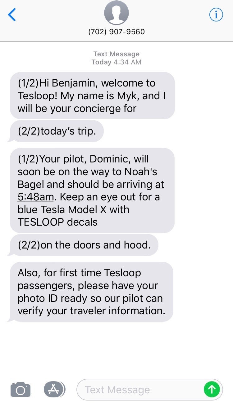 About an hour before my scheduled departure time, I received a text from Myk, the concierge for my trip. The text confirmed departure details and also included other information such as my pilot's — what Tesloop calls their drivers — name and color of my car.