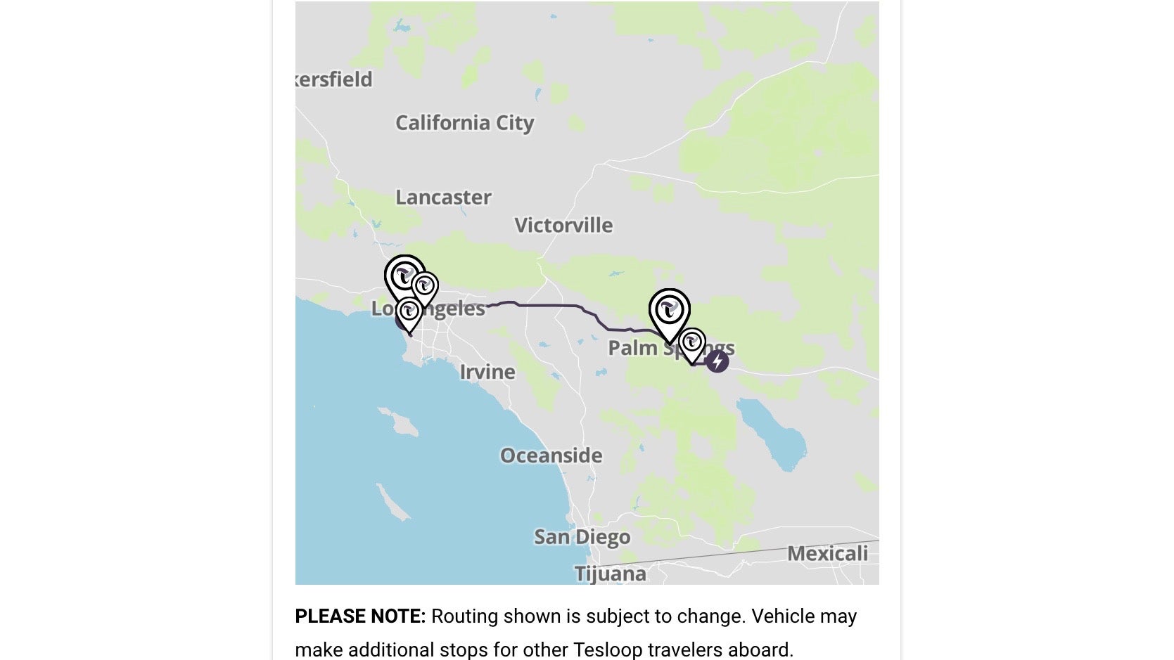 Prior to completing my booking, I was shown a map with my trip's full route. I'd be joining the loop at Noah's Bagel in Culver City and getting off at the Colony Palms Hotel in Palm Springs. We'd also be making two stops in the Los Angeles area to pick up other passengers along the way, but wouldn't be needing to stop to charge the electric car.