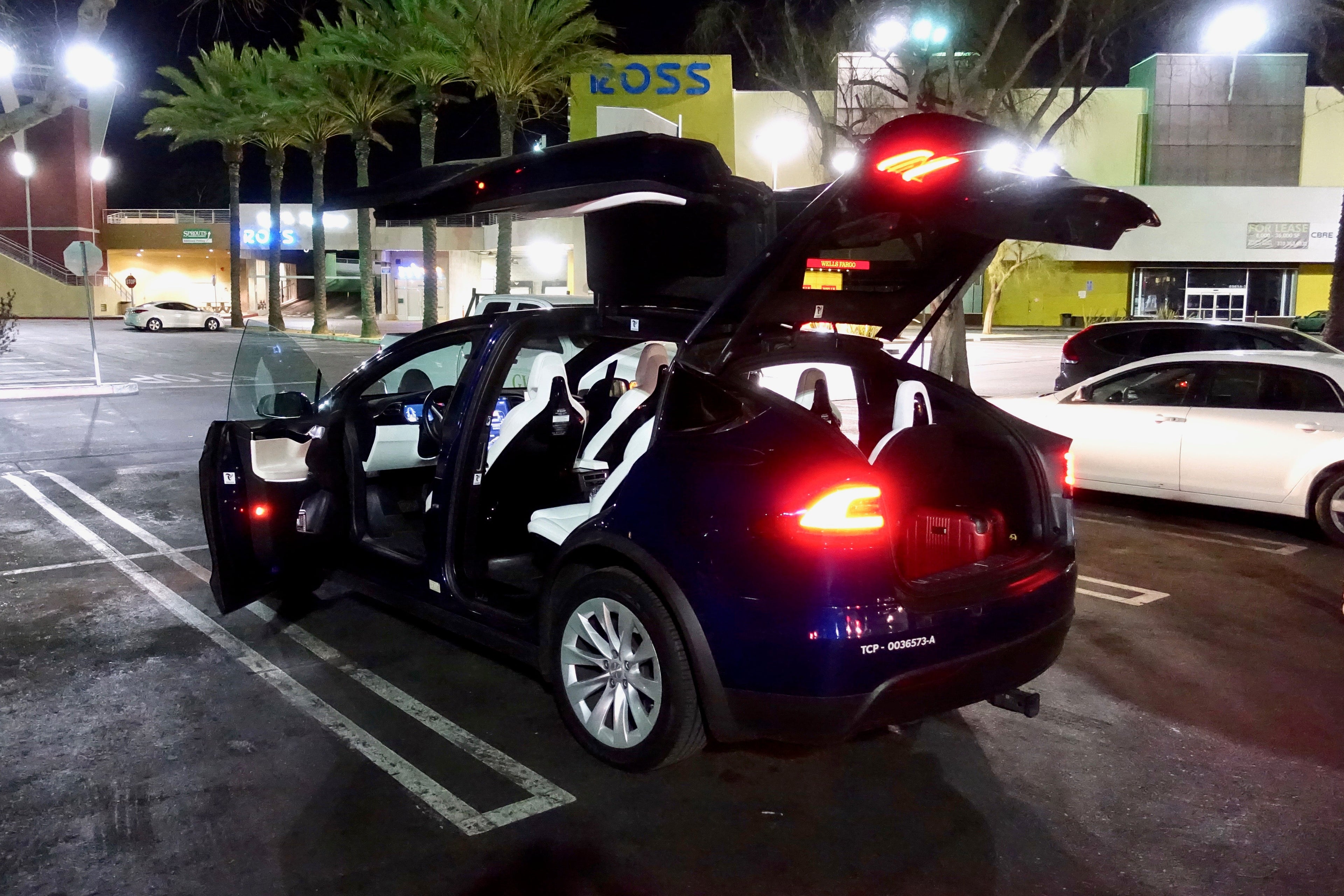 I arrived at the designated pick-up spot at about 5:40am for my 5:48am departure. In this case, it was the parking lot of a small shopping center, but the roughly 100 other pick-up locations include hotels and Los Angeles International Airport (LAX). At about 5:45am, a Tesla Model X with the company's logo on the sides pulled in and immediately illuminated the parking lot. Its falcon wing doors popped open like a Batmobile and then Dominic, the pilot, came out to introduce himself. Check-in was as simple as giving my name and showing a photo ID. Unlike airlines, Tesloop is a bit more understanding if you're running late for your departure. Cars will wait up to 10 minutes after the scheduled departure time before leaving without you.