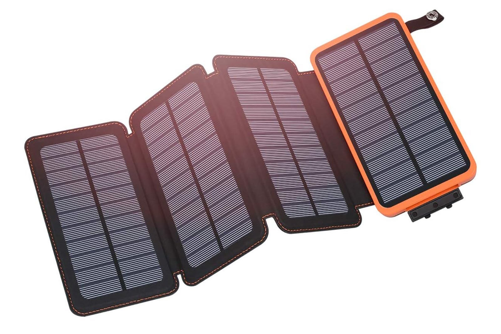 This waterproof solar charger can charge phones up to 10 times or tablets up to four times once its four foldable solar panels have absorbed the necessary sunlight. When it's time for a solar top-up, you can clip the charger onto your backpack with the panels open. You can even use a micro USB cable to juice up the charger, too.