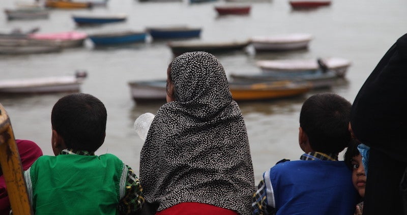 Colorful boats dot the bay outside the Gateway of India.