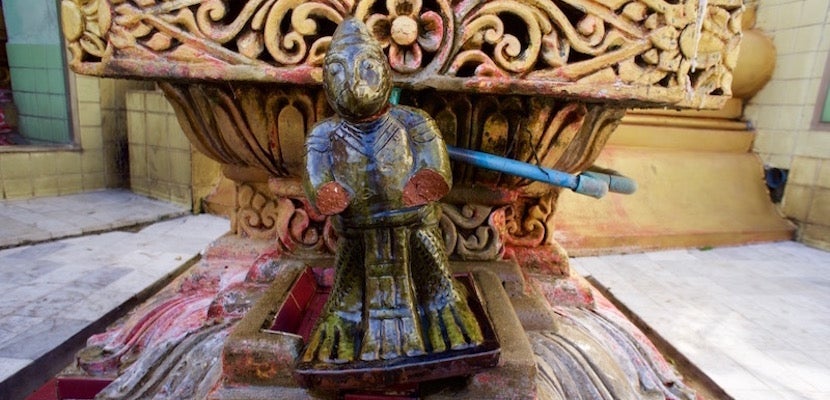 For a real thrill, ask your guide to take you to the snake pagoda. About a 45-minute ride from the ferry terminal in the middle of a large pond floats a shrine to one of the creepiest of creatures. A number of Burmese pythons (estimated by some to number around 30) live inside this Buddhist shrine, Baungdawgyoke Pagoda, where they hang from the rafters, drape themselves across the banyan tree, rest on windowsills and cuddle among four Buddhist statues. This is no zoo exhibit. There are no Plexiglas dividers. The snakes, free to come and go as they may, choose to stay here, to rest here, to, dare I say, worship here. Three nuns care for the snakes overnight and feed them a diet of cow's milk, served in what appears to be cereal bowls. Note that there is some confusion online about the name of this landmark, so when in doubt, come armed with a photograph because local guides know where this place is — while there are several notable snake pagodas throughout Myanmar, this is the closest one to the city of Yangon.