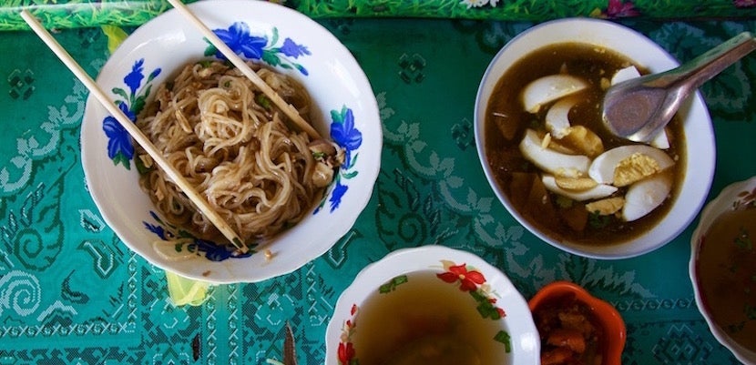 Everyone in Yangon has a favorite tea house. They are easy to spot, filled with squatty tables and plastic chairs, and will be crowded so long as the sun is up. These modest establishments also offer food, which can be delicious. In addition to your order of tea — I prefer le pe ye, or tea with condensed milk — try an order of Burmese dumplings, called baugh se (pronounced "bot-see"), or sticky shan noodles, served with chicken (kyaatsarr), beef (aamellsar), Burmese yellow tofu (won ta hpo) or shrimp (puhcwan).