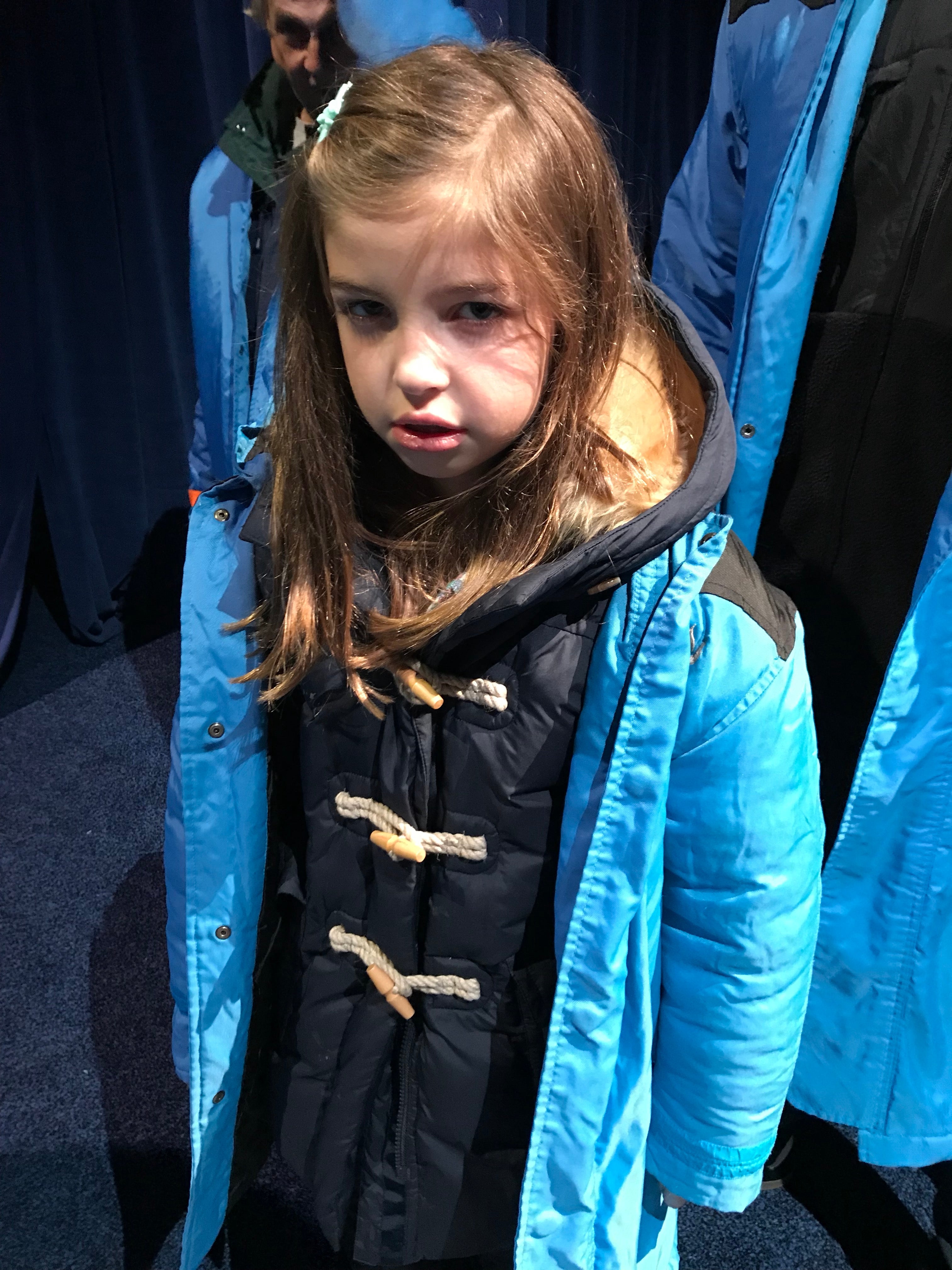 Knowing ICE is kept at 9 degrees, we all came prepared for a hike through the arctic tundra, but that actually wasn't a great plan as they sort of require you to take these massive blue ICE parkas. This is great if you don't have winter gear with you, but it isn't that great when you already have a huge coat on and start sweating bullets managing all your gear and a toddler. So, skip wearing big jackets knowing they hand you one, but do bring gloves and potentially a hat. The one exception may be if you are going with a toddler as they didn't have any tiny-human-sized jackets available.