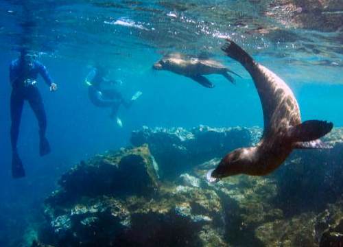1. Plaza Sur, Galapagos Islands. Located on the northeastern coast of Santa Cruz, Plaza Sur is a tiny island of just 32 acres. It's fairly loaded with wildlife, both above ground and underwater. This bite-sized paradise is one of the world's best spots to see sea lions. Relatively unfazed by humans, the pinnipeds will swim right up to you. Another potential sighting is the marine iguana who you might find slowly climbing in and out of the water to sunbathe on the rocky shore. When you come up for air, check out the the wide variety of seabirds here, such as the rare Galapagos hawk.