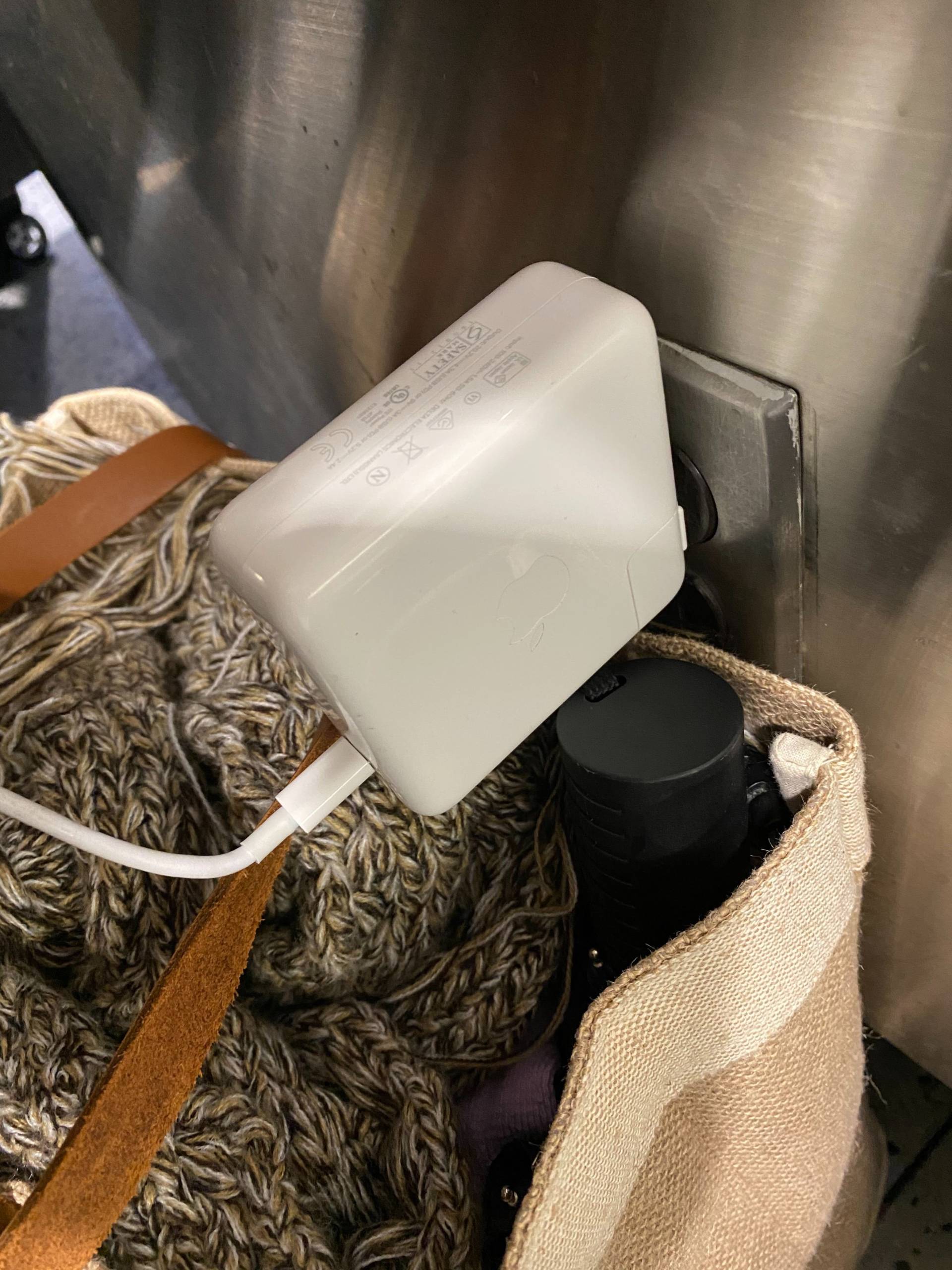 After being denied access to the empty lounge, I made my way to the general seating area in search of a power outlet. Outlets were few and far between. The first seating area had one plug, but it was covered in tape. I made my way to the second seating area and was able to snag both an outlet and a seat, but I had to hold my plug in by balancing it on the umbrella I had in my bag.