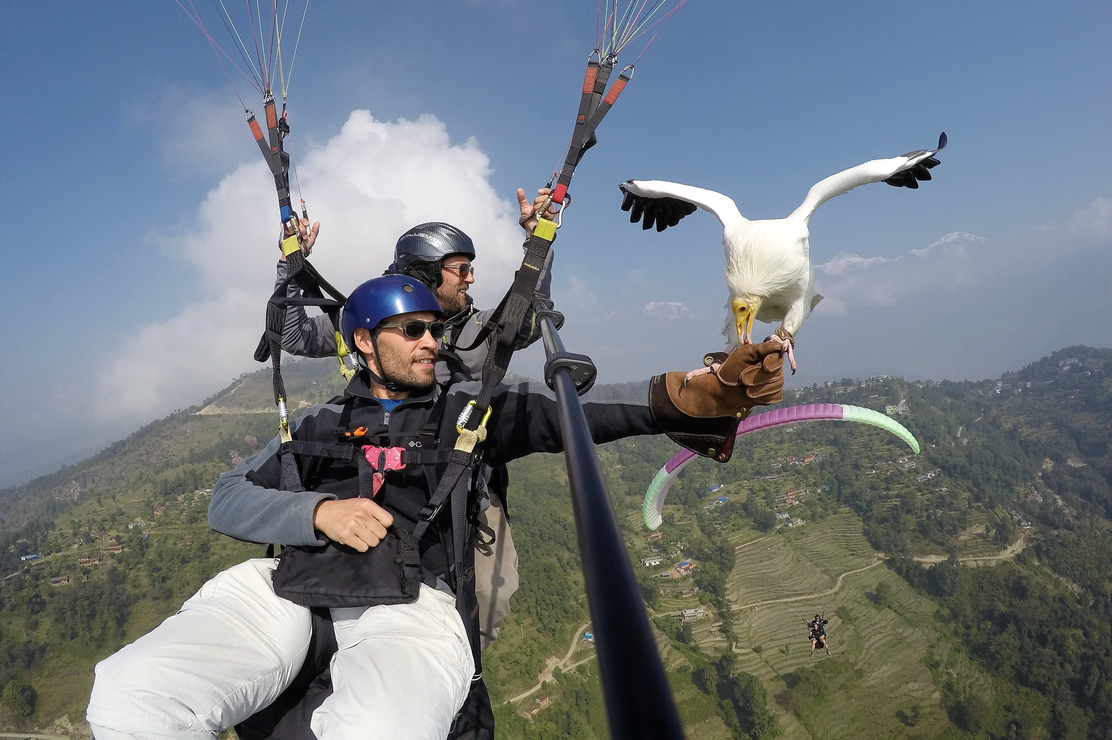 Why just paraglide when you can paraglide with hawks? Image courtesy of Chris Jung.