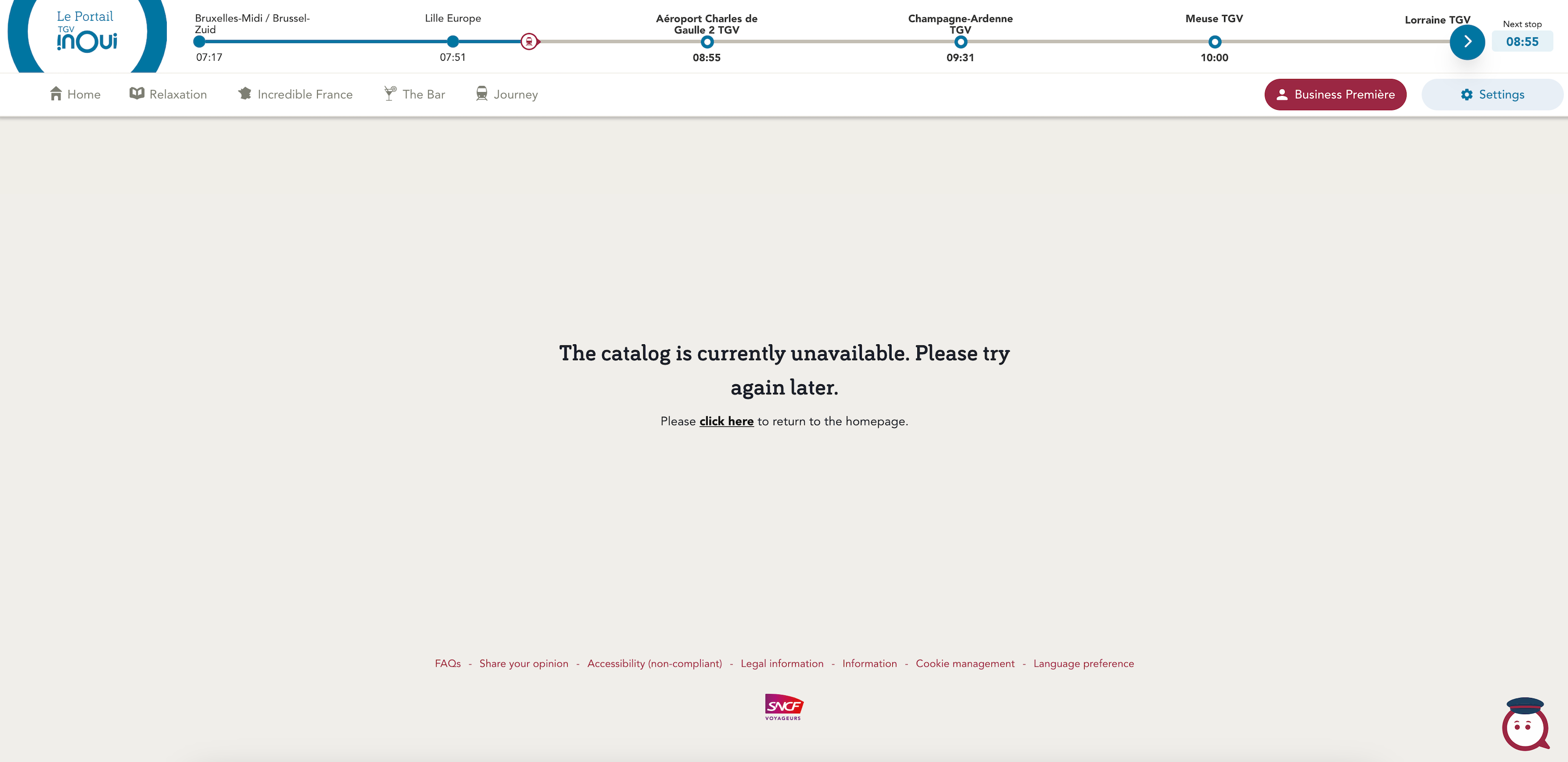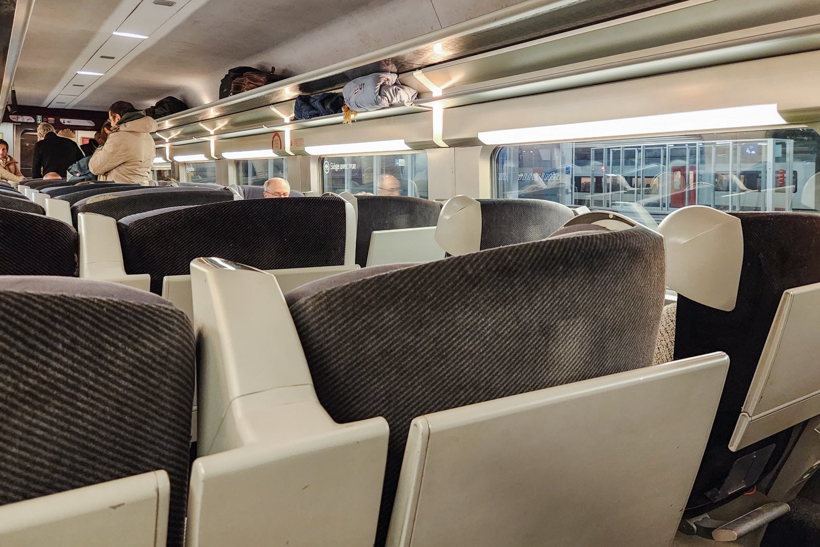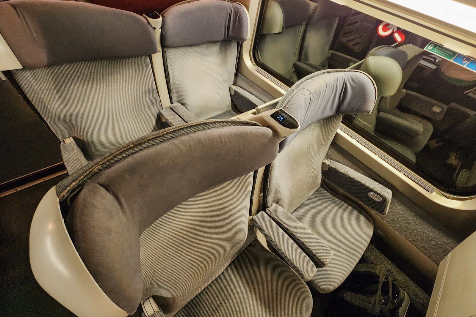 Our first-class train seats weren't exactly what you'd expect from first class in the sky. They reclined but not far. There was no meal service, just a selection of items that you could order online and pick up in the dining car. There were free (albeit spotty) Wi-Fi and a selection of movies, shows, podcasts and games available on the SNCF (French train company) portal, though these crashed when I tried to stream them.