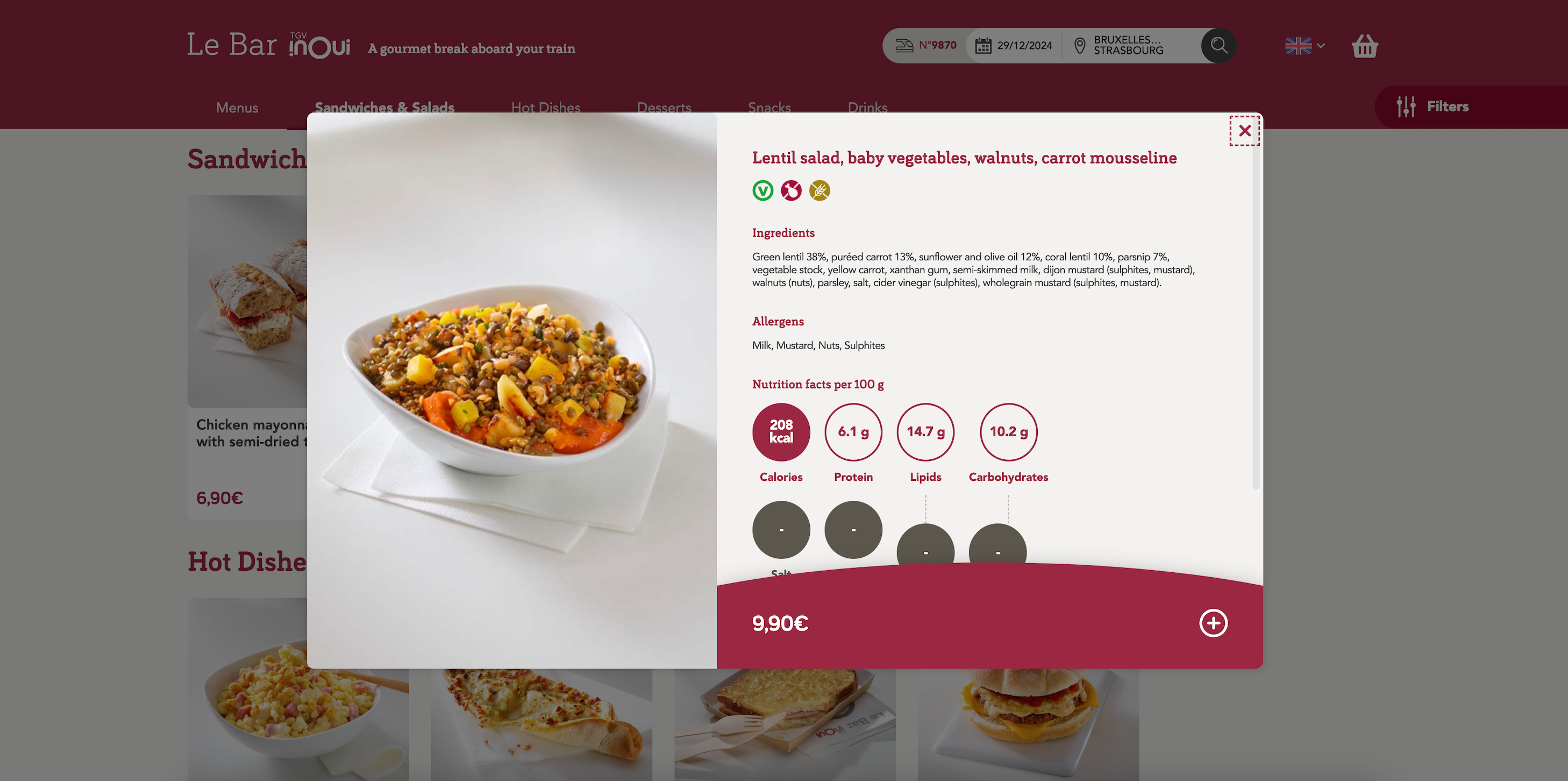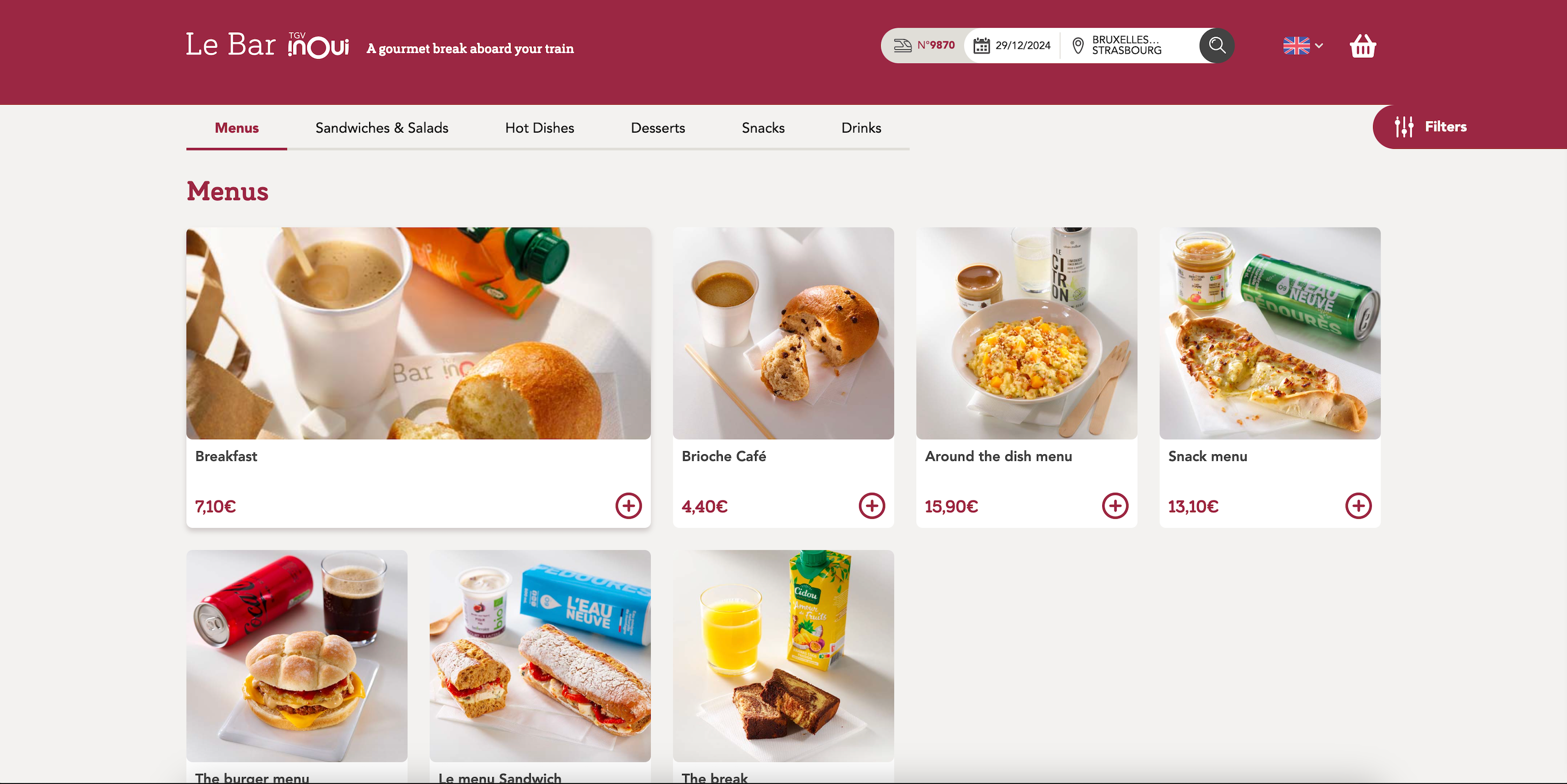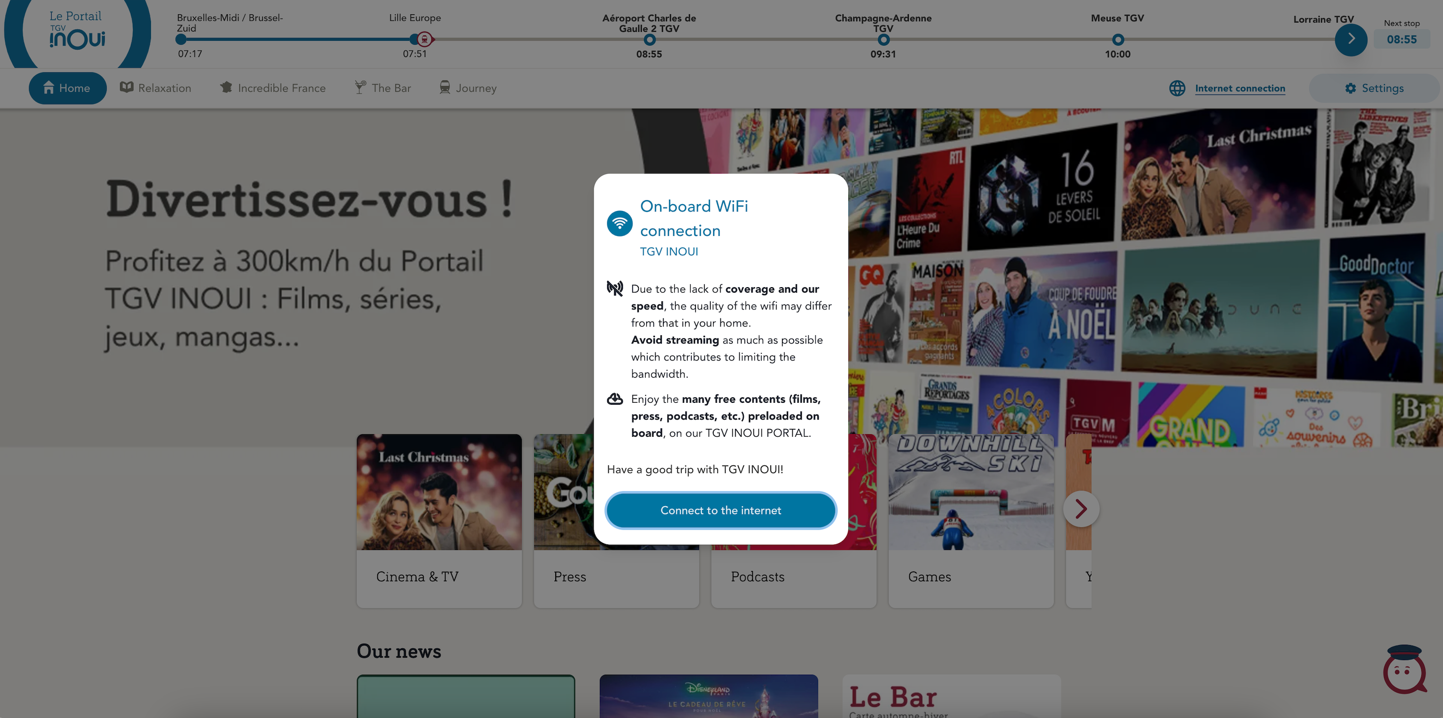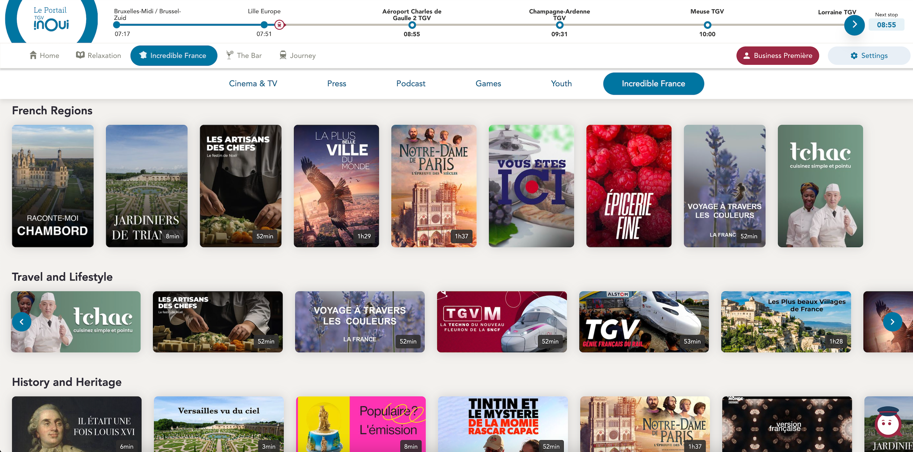 Our first-class train seats weren't exactly what you'd expect from first class in the sky. They reclined but not far. There was no meal service, just a selection of items that you could order online and pick up in the dining car. There were free (albeit spotty) Wi-Fi and a selection of movies, shows, podcasts and games available on the SNCF (French train company) portal, though these crashed when I tried to stream them.