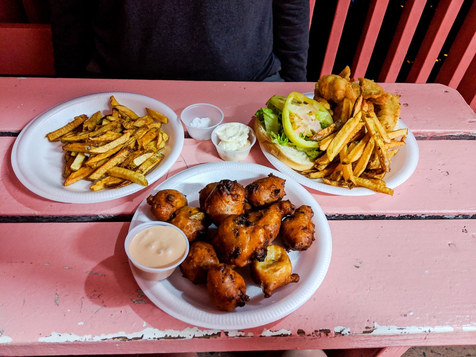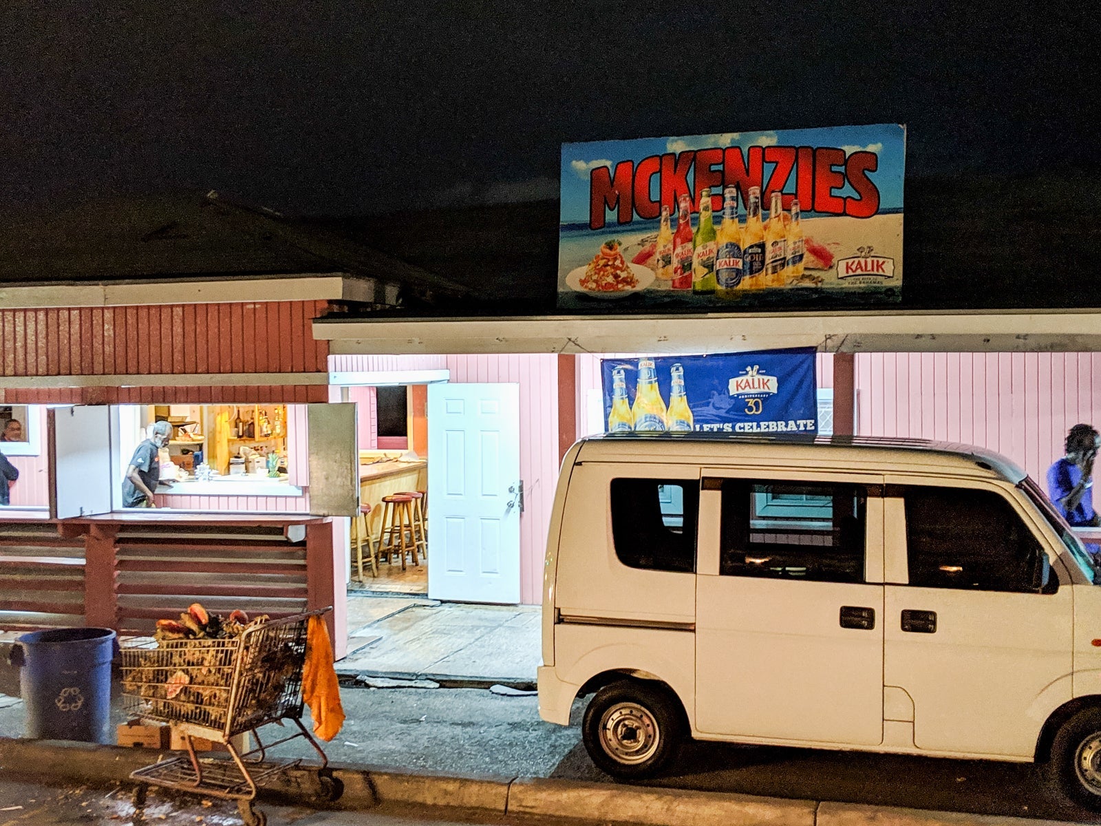 On our second night we took a short 15- to 20-minute walk over the bridge going off Paradise Island to Mckenzie's Fresh Fish & Conch. The walk is easy (there's a sidewalk along the bridge) and there are numerous small restaurants at the end of the bridge. The pink one right at the end of the bridge is Mckenzie's, which takes credit cards and serves Bahamian food. We ordered two Kalik beers, a conch salad, conch fritters, a fish sandwich and fries for $42 including tax and tip -- although this was more food than was needed for two people. Some of the fish is served with skin on and bones in, so if you're a picky eater, be careful when ordering.