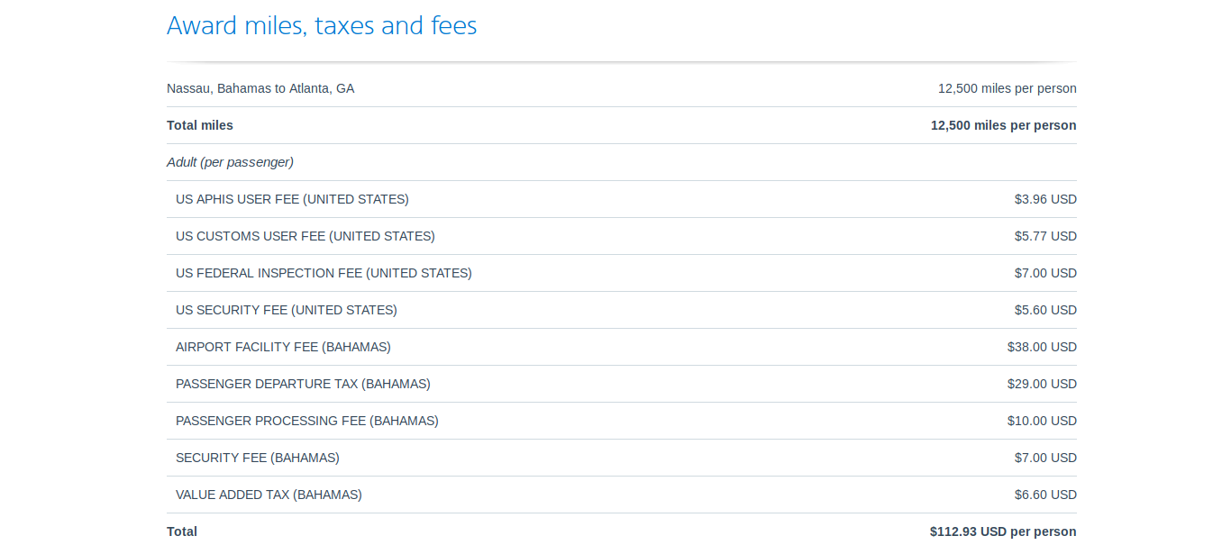 So, if you can find reasonably priced round-trip flights or a cheap one-way flight departing from the Bahamas, this may be be better than using miles and still playing high taxes and fees. Note that the high taxes and fees only apply to flights departing the Bahamas; You'll only pay the normal $5.60 US security fee on an award flight from the US to the Bahamas.