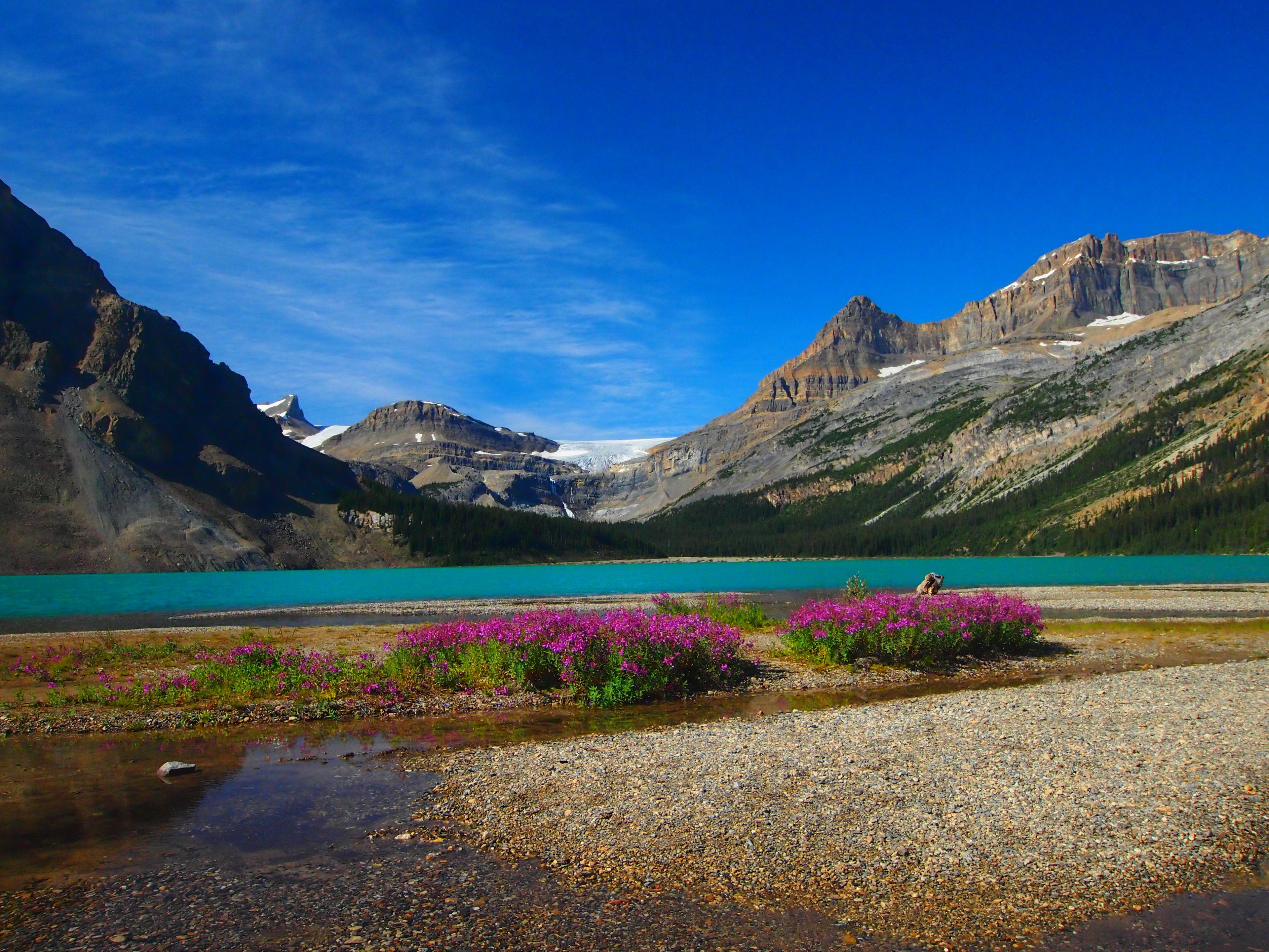 The road from Banff to Crowfoot Glacier is 56 miles. Resembling a crow's foot, the glacier is wedged high in Crowfoot Mountain. Five minutes further up the road is Bow Lake. The dazzling turquoise waters are surrounded by mountains with snow on their upper reaches and pine forests below. During the summer, bright wildflowers bloom, making this a colorful place to take a walk.