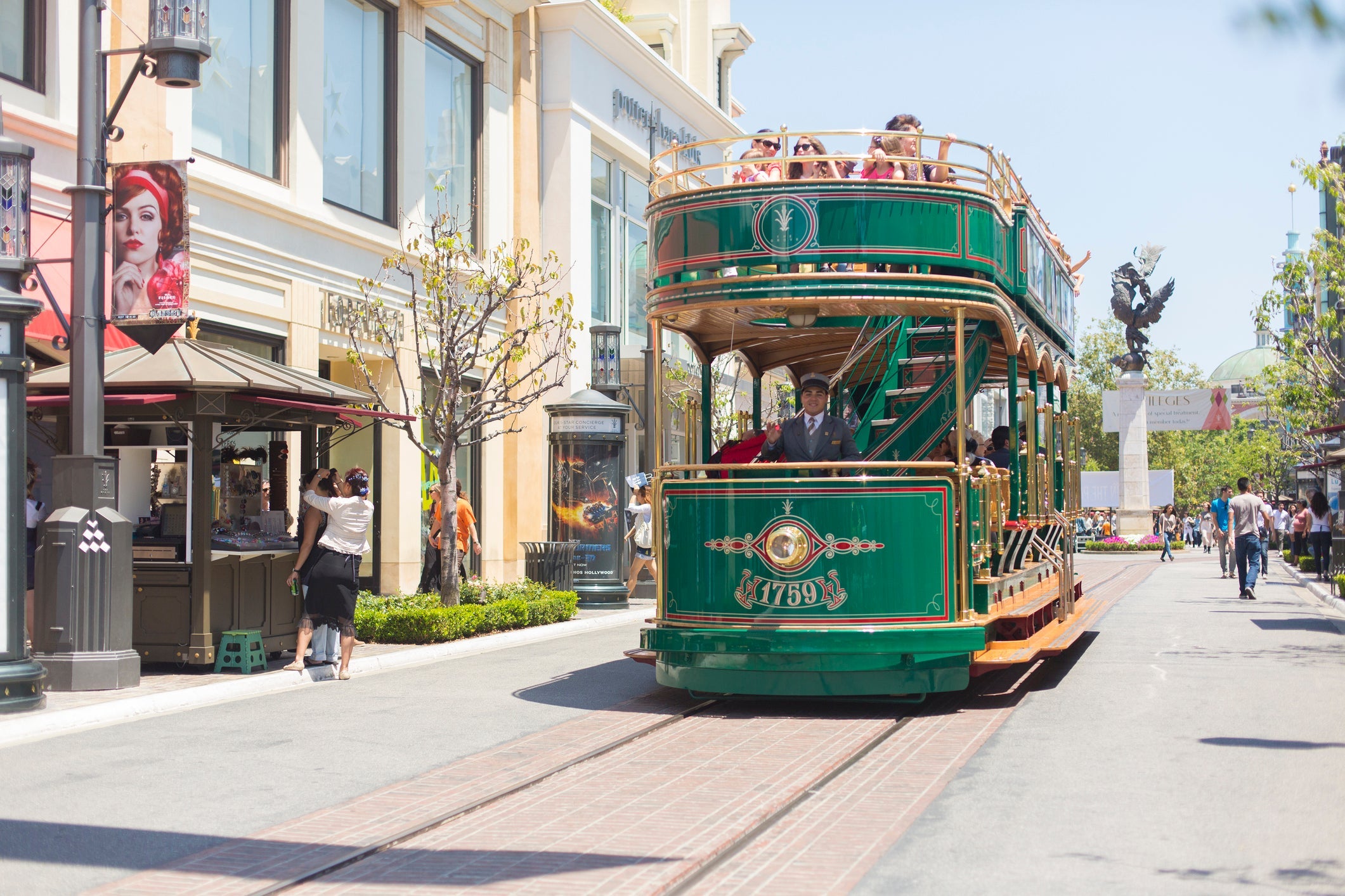 The Grande Dame of all shopping streets, Rodeo Drive has been home to luxury retailers for decades. Here, visitors can find the likes of Harry Winston, Louis Vuitton, Chanel, Gucci, Coach and many more designer brands. Rolls Royces, Maseratis, Bentleys, Range Rovers and the occasional Lotus fill the parking spots. Fashionably dressed women and men shop as if money is no object, and visitors can participate — or simply walk around and take in the scenery. For a break, walk to the end and have a nice cocktail at the Beverly Wilshire, a Four Seasons Hotel: location for the filming of "Pretty Woman."