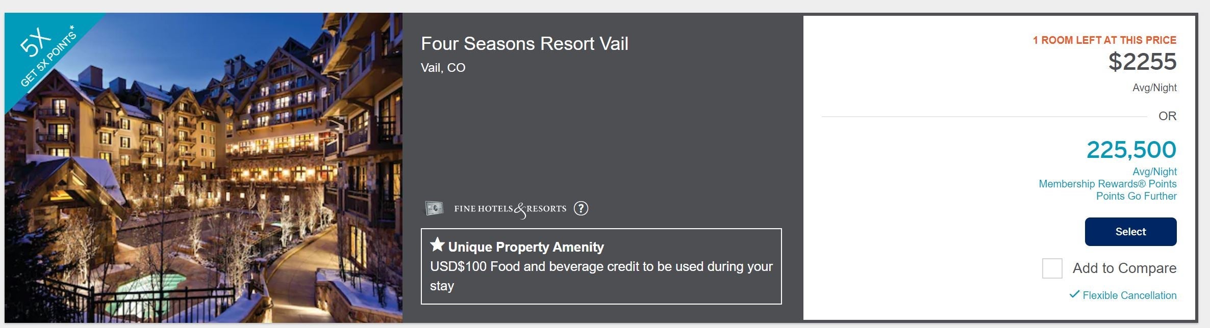 In Vail, the Four Seasons priced out at a staggering $2,255 per night. Even the thought of 5x American Express Membership Rewards points if I used The Platinum Card® from American Express to book the stay through couldn't help me stomach that price.