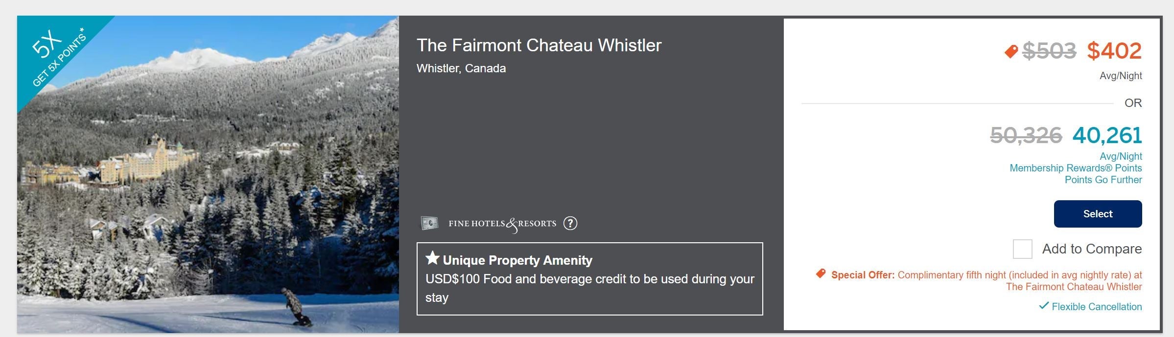 With a fifth-night free promotion, you can stay at the grand dame ski in/ski out in Whistler, the Fairmont Chateau Whistler, which just underwent a $23 million renovation. It averages $402 per night through Amex FHR with a $100 food and beverage credit plus free breakfast.