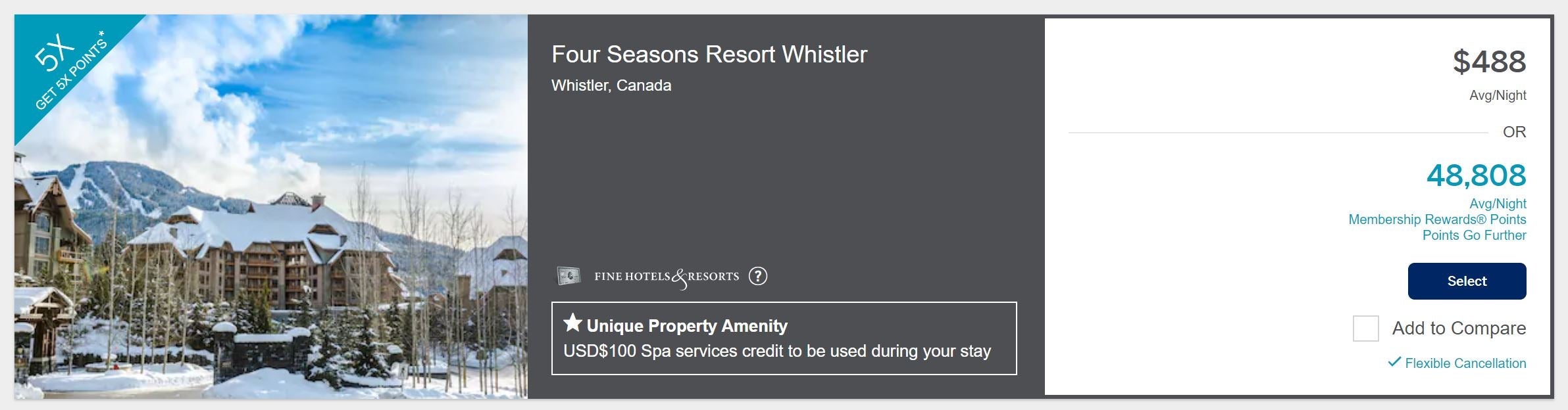 Up in Whistler, the newly renovated Four Seasons -- with a ski concierge and hot chocolate awaiting your return at the end of the day -- will set you back an average of $488 per night. While still expensive, it's less than a fourth of the cost of the Vail Four Seasons. By booking through Amex Fine Hotels & Resorts, you receive a one-time $100 food and beverage (Vail) or spa credit (Whistler). Fine Hotels & Resorts is one of my favorite programs because of its inclusions such as free daily breakfast for two.