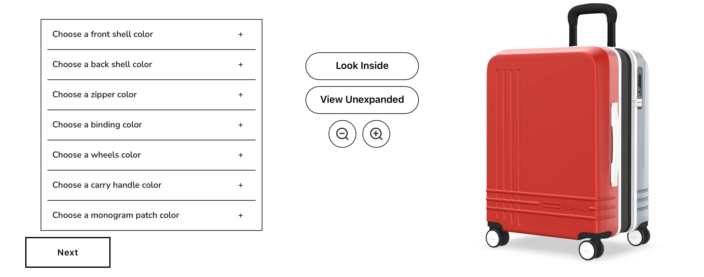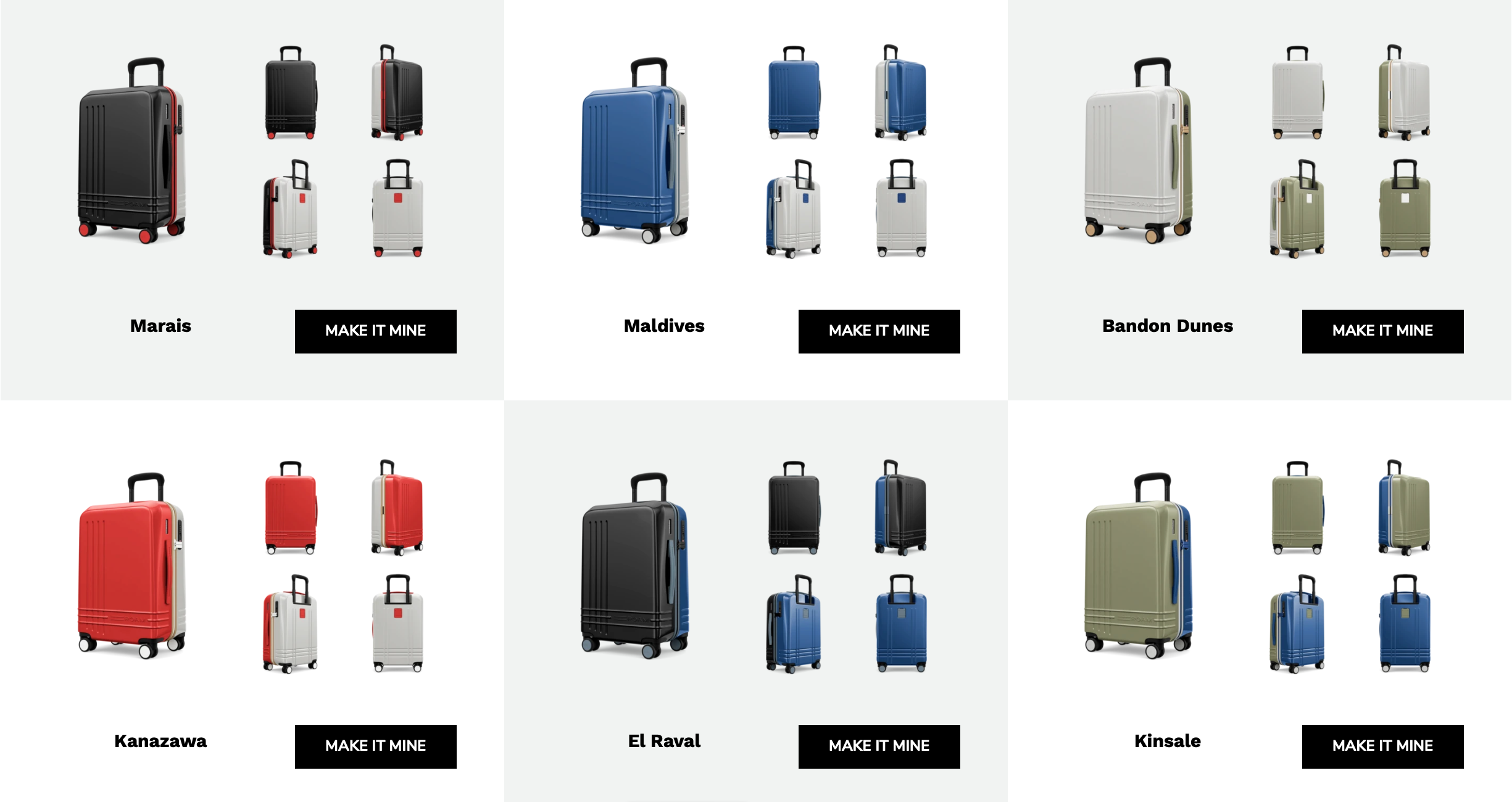 It allows you to fully customize your suitcase by choosing the colors of the front and back shell, the trim, the zipper, the binding, the wheels and the carry-on handle. The website walks you through the steps and it's pretty easy. If customization isn't for you, there's a gallery with 16 versions of the suitcases.