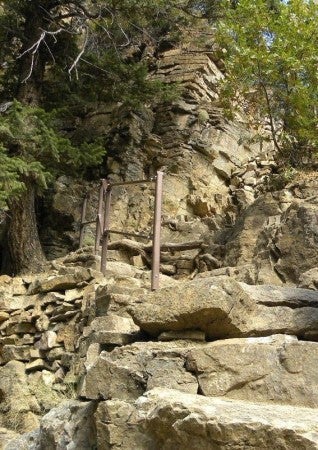 This part of the climb is made on a set of distinctly cut and chiseled steps in the rocky base. Hand rails line part of this section for safety and to facilitate the ascent.