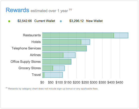 Everyone likes getting compliments, and I love that the Maximizer quickly identifies where I'm already making the most of my credit card spending. One of my favorite cards in my wallet is the Chase Ink Plus Business Card, which offers 5x Ultimate Rewards points for purchases at office supply stores, and with internet, phone, and cable/satellite TV providers. As shown in the chart above, the Maximizer lets me know that I have no room for improvement in those areas!