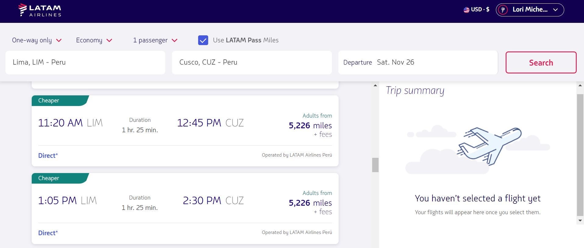 LATAM flights from Lima to Cusco using LATAM Pass miles. LATAMAIRLINES.COM