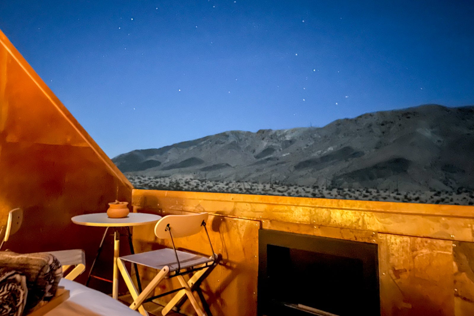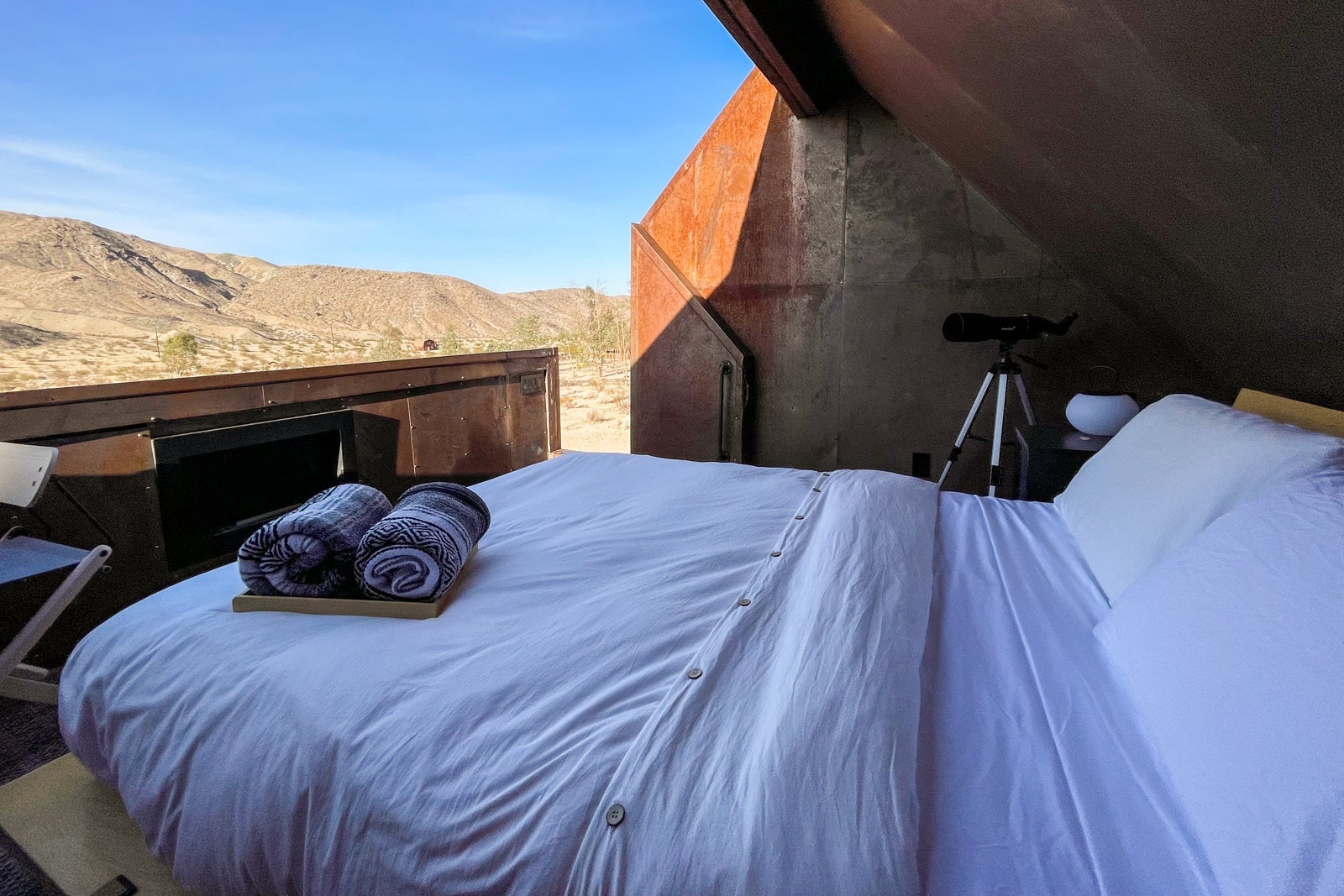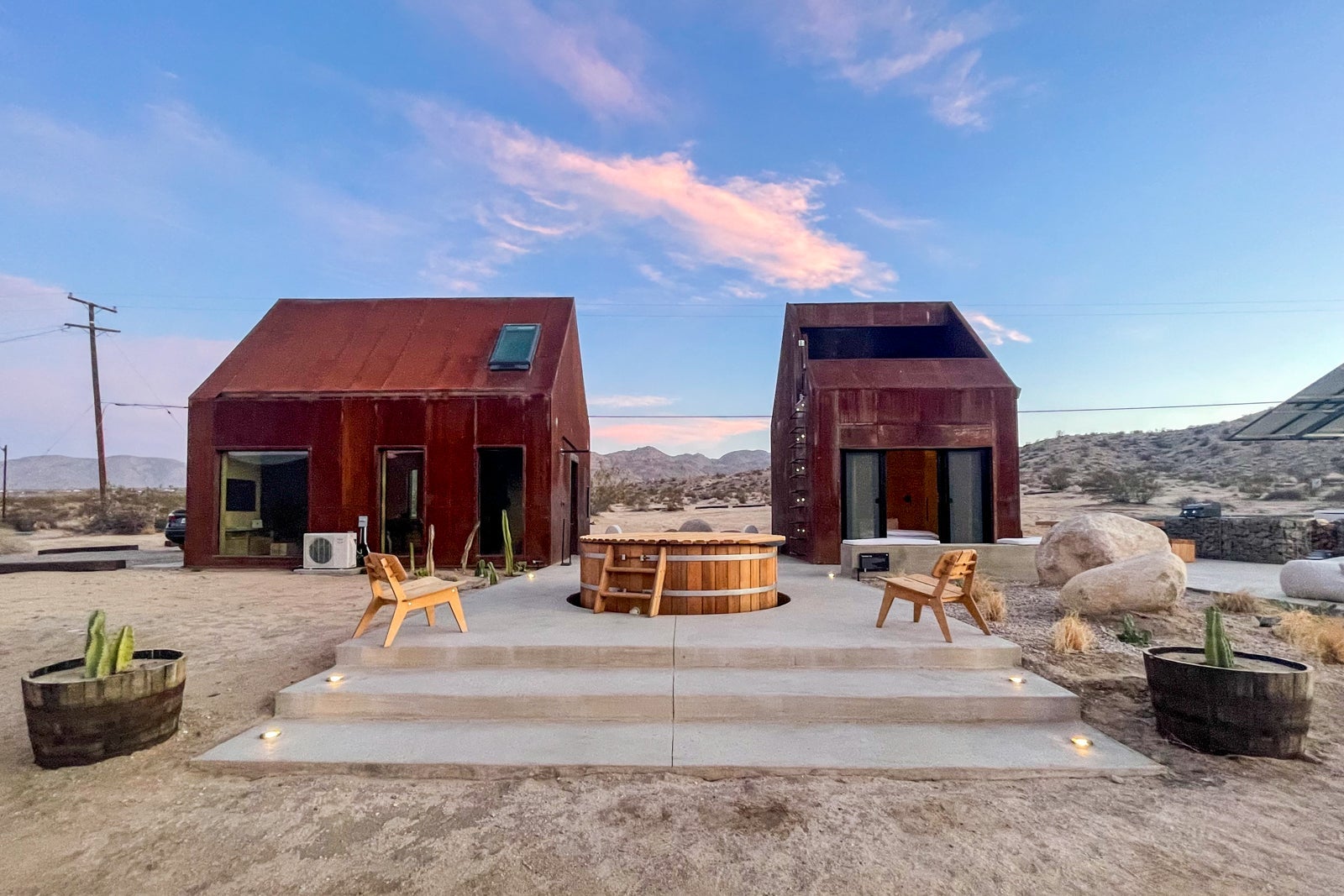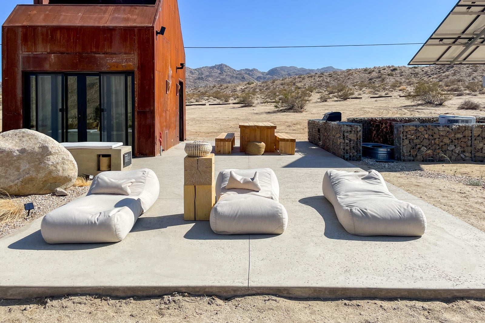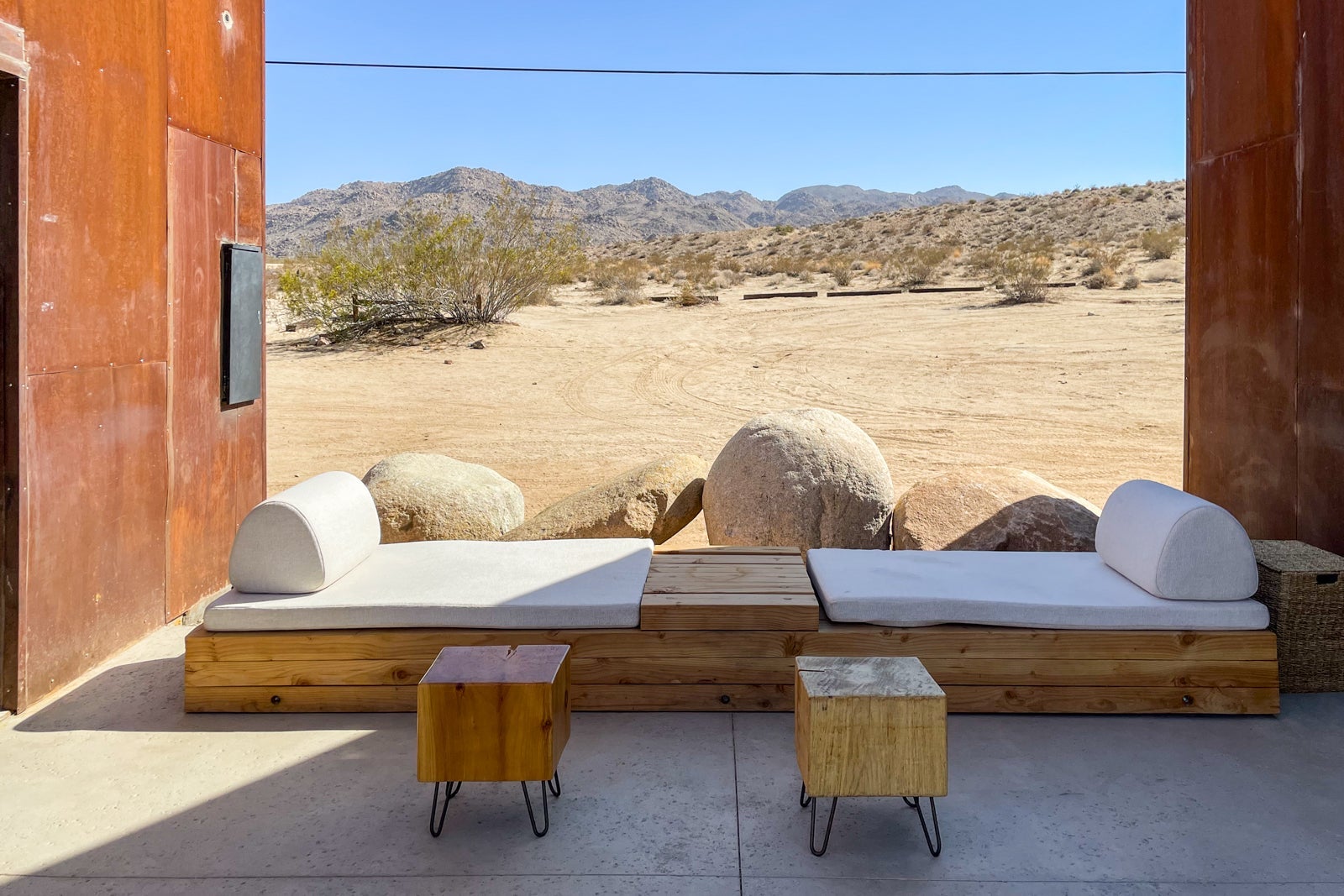 I was enraptured with the property, which I later discovered is called Folly Joshua Tree. Its twin-gabled cabins clad in reclaimed weathered steel resembled a dystopian outpost on the periphery of Joshua Tree National Park and its leviathan boulders and namesake yuccas.