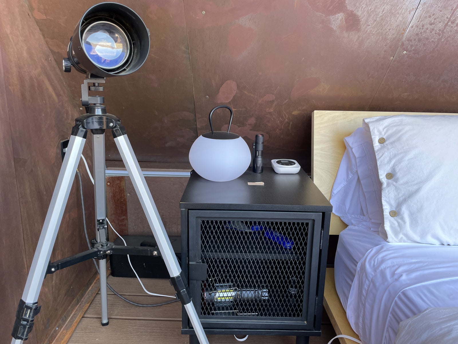Like Goldilocks, I drifted from room to room, deciding which of the three bedrooms I'd choose for the evening. First, I scaled the ladder on the exterior of the smaller second cabin to reach the open-air bedroom that gives the property its name on Airbnb (Architect's Off-Grid Stargazing Cabin). With a cozy queen bed and a high-tech telescope, I intended to spend the evening dozing beneath the stars. However, the breeze was picking up when I arrived, and I worried the extra blankets might not be enough to keep me from feeling chilly.