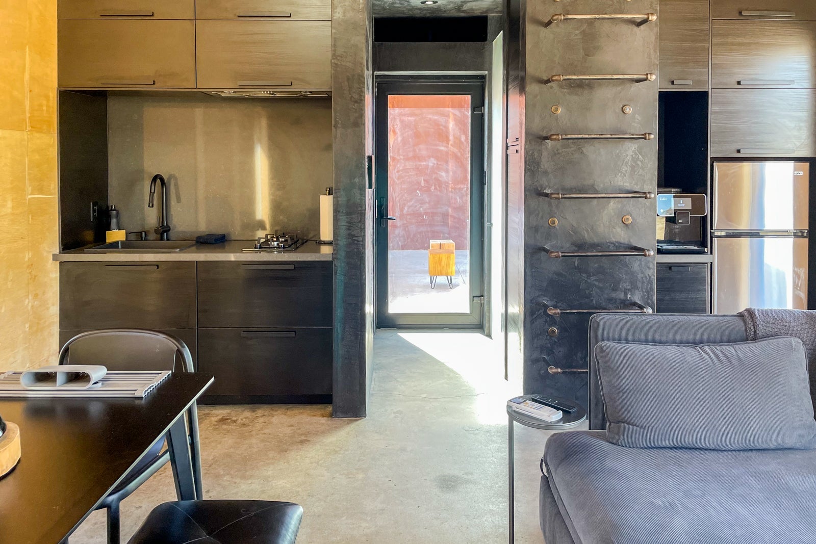 Here, guests have access to a bathroom equipped with a USPA bidet and washbasin, a separate shower room with a full-length window overlooking the desert and a decorative boulder feature. There's also a kitchen, dining and living area that has a flat-screen TV equipped with Hulu, Netflix and Amazon Prime.