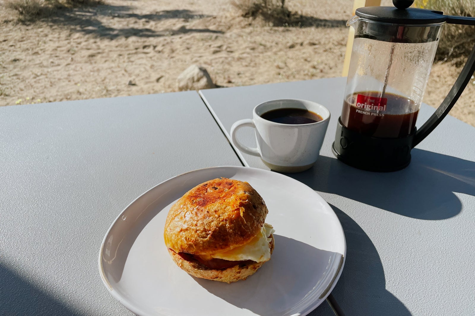 One of the perks of the AutoCamp — even though it was out of fire starter — is that the main building also features a general store and a kitchen serving everything from two-person grill kits to grab-and-go salads, breakfast quesadillas and hearty mains. The next morning, unwilling to fuss with another match or strip of newspaper, I ordered a breakfast sandwich and fixed myself a hot carafe of Canyon Coffee from Los Angeles before heading back to the national park.