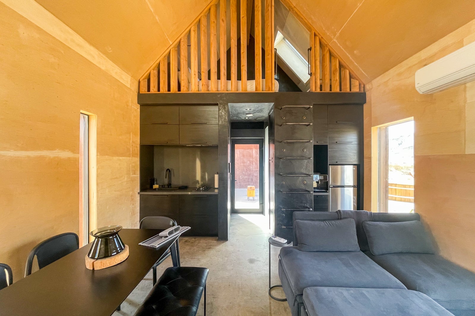 Folly Joshua Tree comprises two separate cabins: The larger, main structure houses the living and dining areas as well as the kitchen, washroom and shower. A ladder leads upstairs to a lofted sleeping area with a queen-size bed. Guests must walk outside and cross the patio to reach the smaller cabin. It offers a downstairs, main bedroom and open-air bedroom on the roof designed for stargazing during the area's consistently clear, dry desert nights.