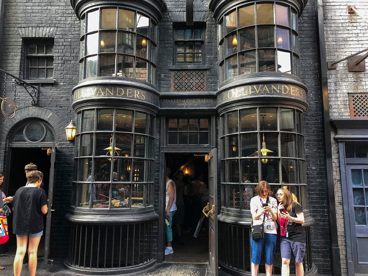 Immediately after that, we stepped over to Ollivanders, the wand shop, and this was our biggest regret for the day. We waited in a 30-minute line before entering the small shop, which was really cool but the shopkeeper only chooses a wand for one audience member. Experience aside, we could buy the same wands at street carts, and we could have saved some time spent waiting in line. The line at the wand shop is typically lighter in the late afternoon/early evening (though that gives you less time to use the wand in the park that day.)