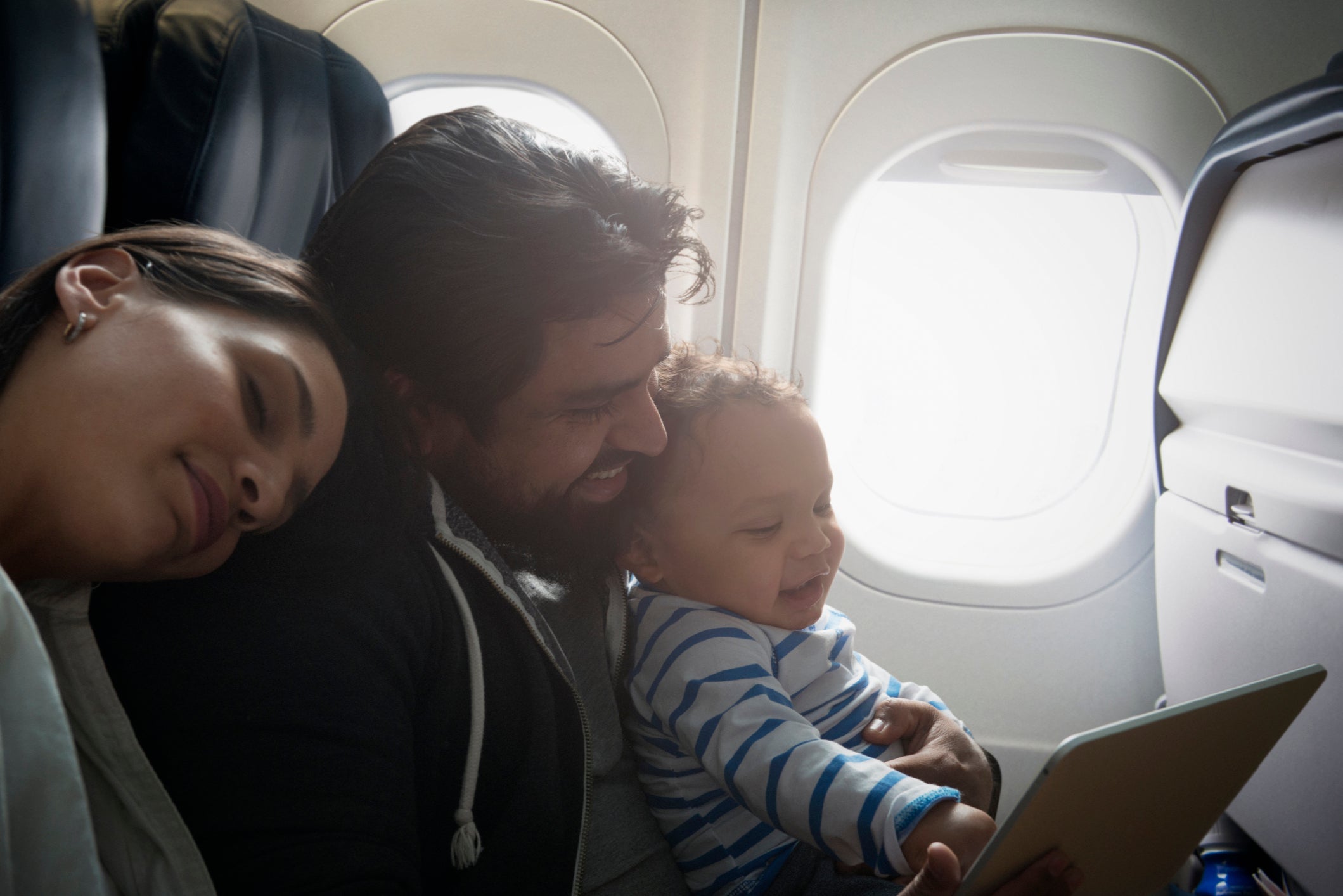 For extra-long flights, try to have everything to help your baby comfortably nap on hand, like a lovey, blanket, pacifier and more. Have changes of clothes on hand for the whole family in case of a messy situation, and enough layers for a plane that may be hot or chilly. A baby carrier can be key, too.
