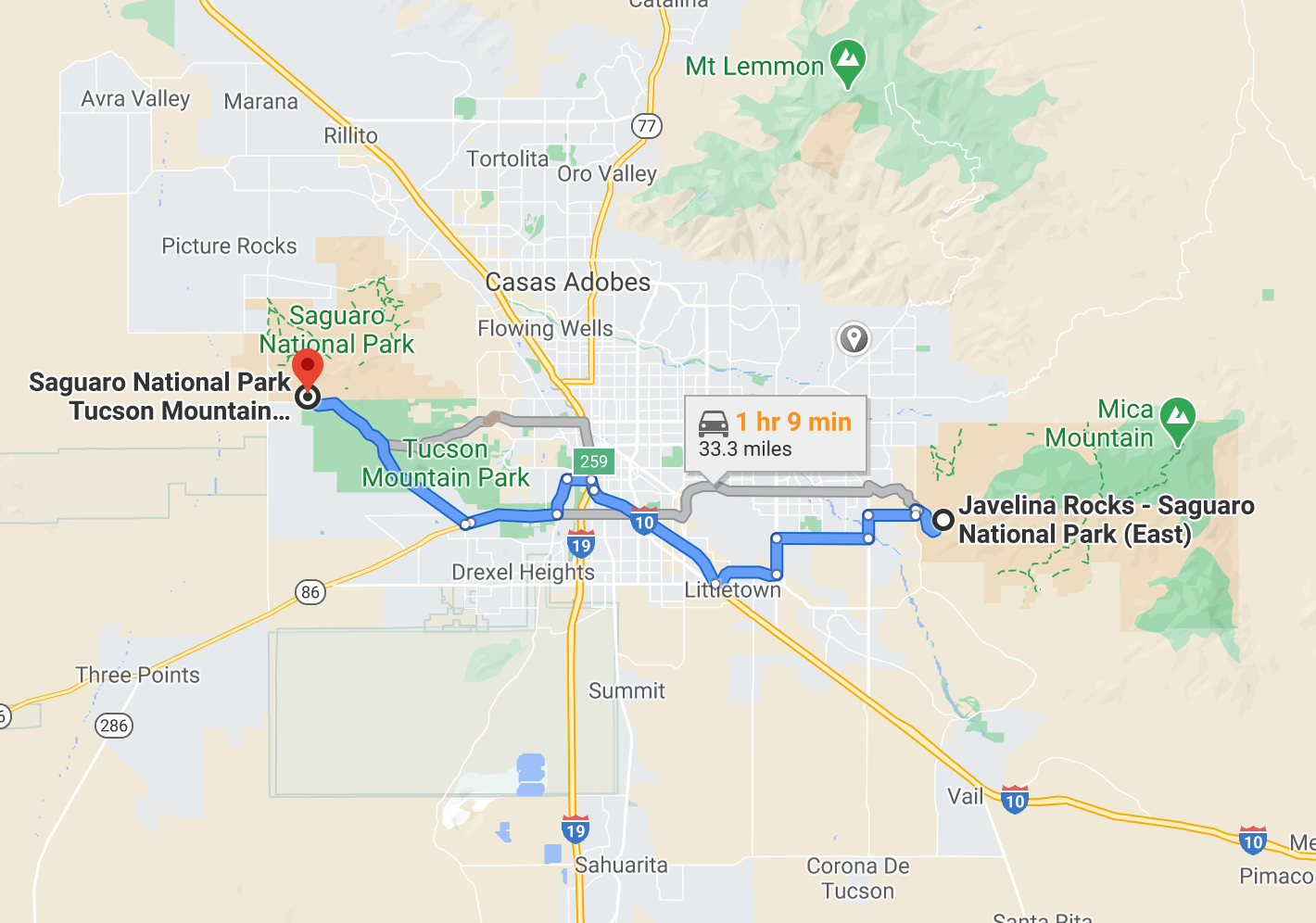 The sections are separated by about 30 miles, and depending on Tucson traffic (which can get very busy), it should take you about an hour to get from one district to the other.