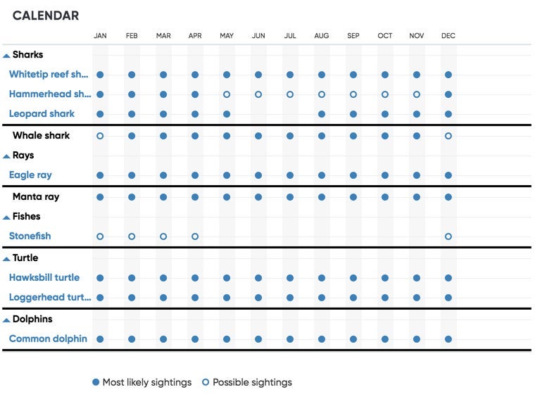 Basically, you're likely to see common dolphins; turtles (hawksbill and loggerheads); manta and eagle rays; and whitetip reef sharks every month of the year.
