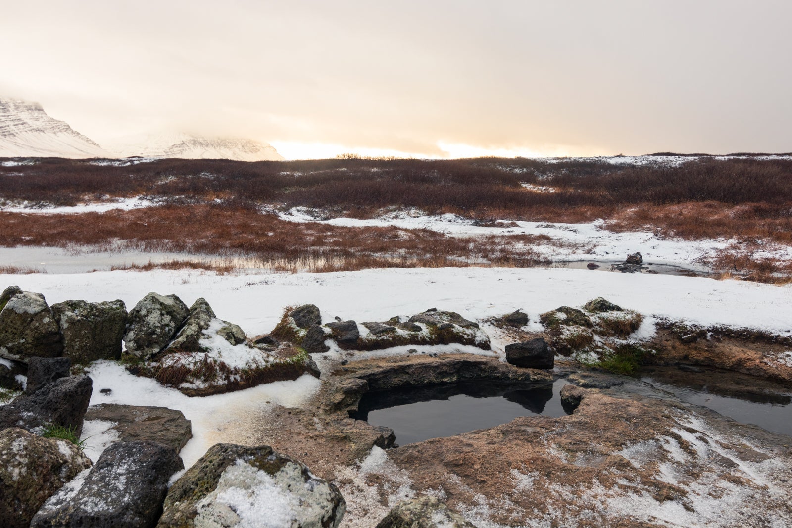 There are two pools located in the general region of Landbrotalaug, and it's easy to miss this tiny hot spring. The larger pool is much cooler and not nearly as soothing. Don't let the pipe with steam pouring out of it deceive you: the real hot spring is located on the other side of the larger spring. With room for just one or two, this hot spring will make you feel truly "in the wilderness," after a quick drive off of the main road. To save you some time, drop these coordinates into your GPS for easy finding: N64°49.933 W22°19.110.