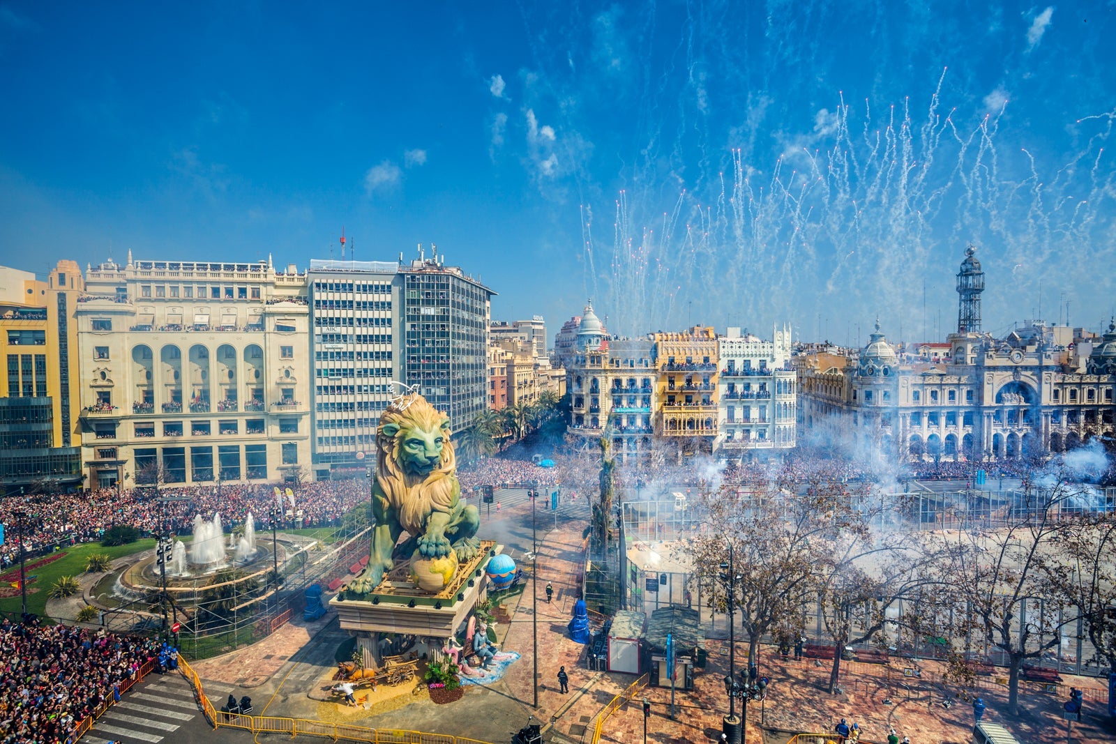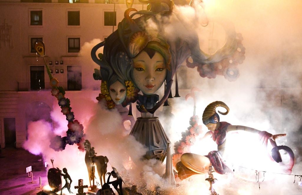 Las Fallas occurs yearly in March in Valencia. Teams spend months building giant, elaborate wooden structures in the form of characters or objects, then spend five days in March burning them down to the awe and delight of both tourists and residents.