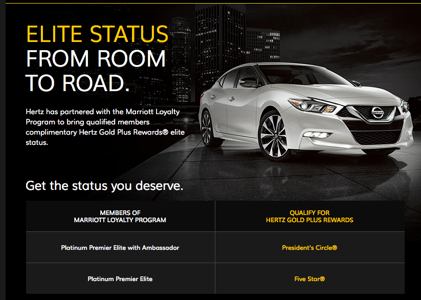 On the other hand, if you have Delta or United airline status, you can also qualify for Hertz Five Star or President's Circle status. If you hold United Club Card or the United Presidential Plus Card (no longer open to new applicants), you'll receive Hertz President's Circle status. Finally, if you have Marriott Platinum or Platinum Premier with Ambassador status, you'll receive Hertz elite status for free: