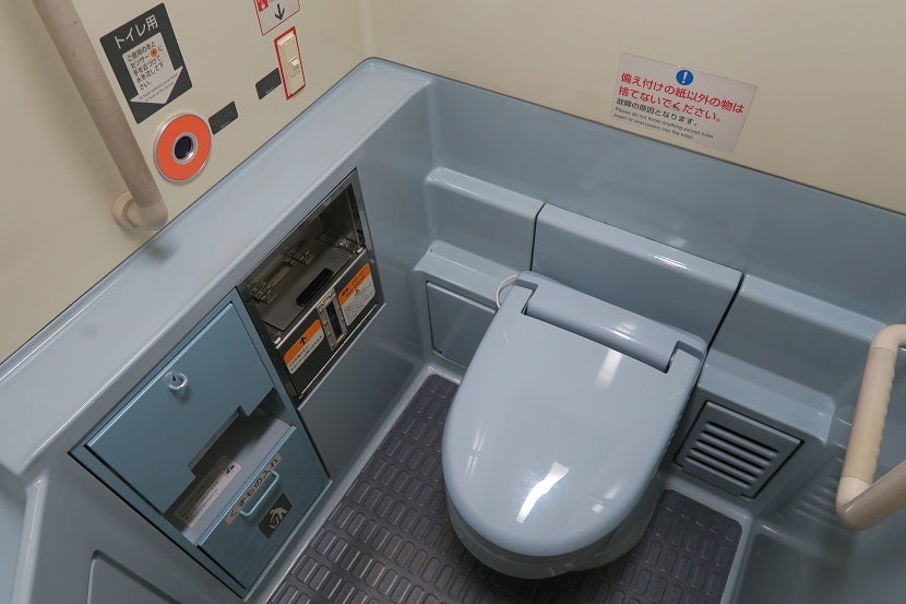 Every few cars in the Shinkansen trains had a set of bathrooms: one female bathroom, one urinal-only male bathroom, one mixed-gender seated toilet and a pair of shared sinks. For some reason, each of the sinks had a curtain that could be drawn for privacy, yet the men's urinal bathroom didn't have a lock on the door.