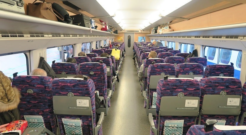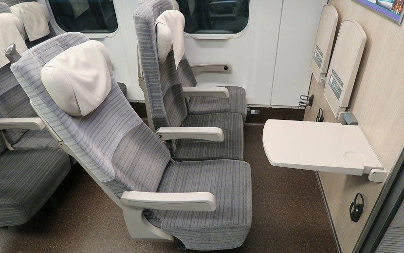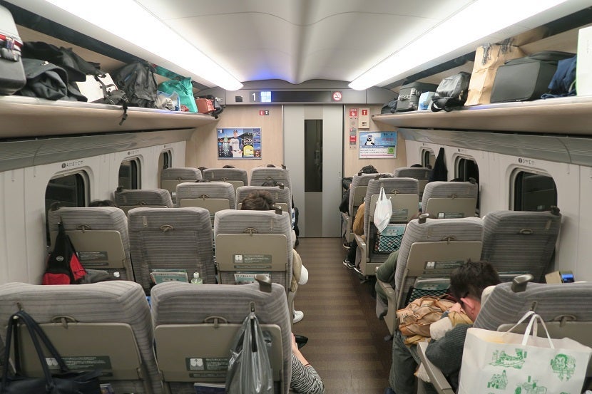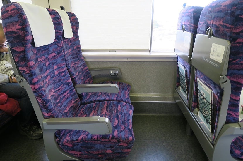 Seats on all Shinkansen trains are arranged in a 2-3 layout in the standard cabin and 2-2 if you pay to upgrade to the first-class Green Car. Almost all seats were forward-facing, with the rare exception of a few pairs of seats that were arranged to face each other, which were in high-demand from families and friends traveling together.