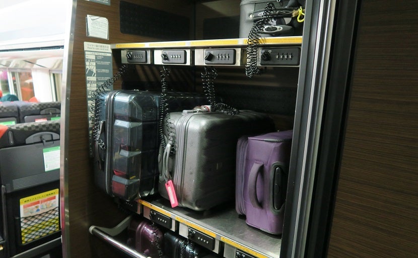 Over each seat on all trains are shelves for smaller luggage. Shinkansen trains also have open compartments for larger suitcases between some cars.