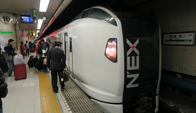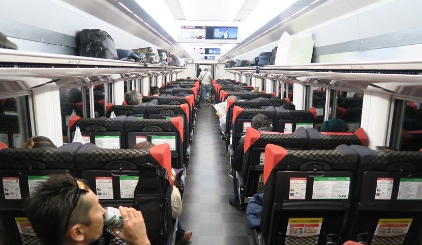 All seats here are reserved, but you don't technically need a reservation to get on, as we found when we arrived at Tokyo Station just before a train was set to depart and were instructed to get on and take a seat. Unfortunately, since there's no display showing which seats are reserved, we had to move a couple of times to make room for passengers who did have reserved seats. We considered standing, but since it's a fast train traveling at least partially on existing subway lines, the ride can be very bumpy. This is the only JR train line where there was an on-board conductor checking tickets, and only those of people who were standing or seated in a non-reserved seat.