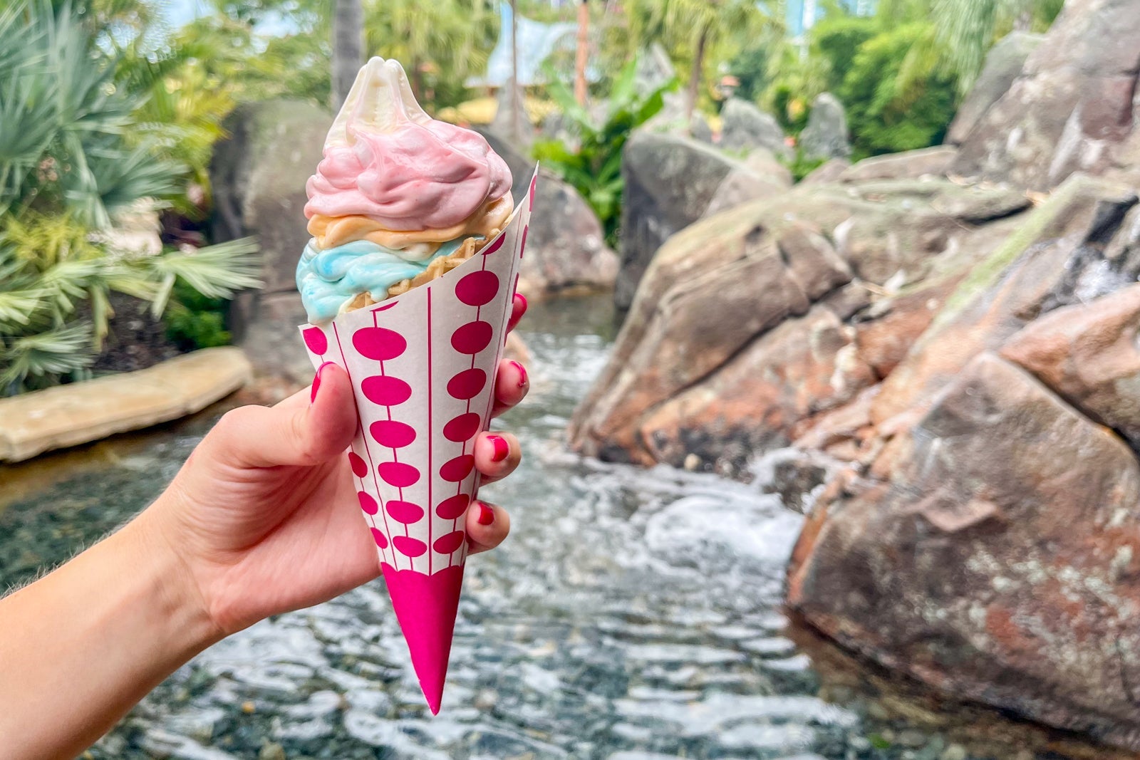 Last but certainly not least, Volcano Bay has one of our favorite (and most photogenic) ice cream treats at Universal: the Waturi Fusion. You can find this blend of orange, blue raspberry, strawberry and banana swirl soft serve at the Koka Poroka Ice Cream Kona stand. Don't forget to snap a photo before it melts.