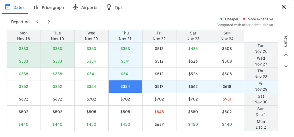 And here's a bird's-eye view of round-trip pricing from Boston in November via Google Flights: