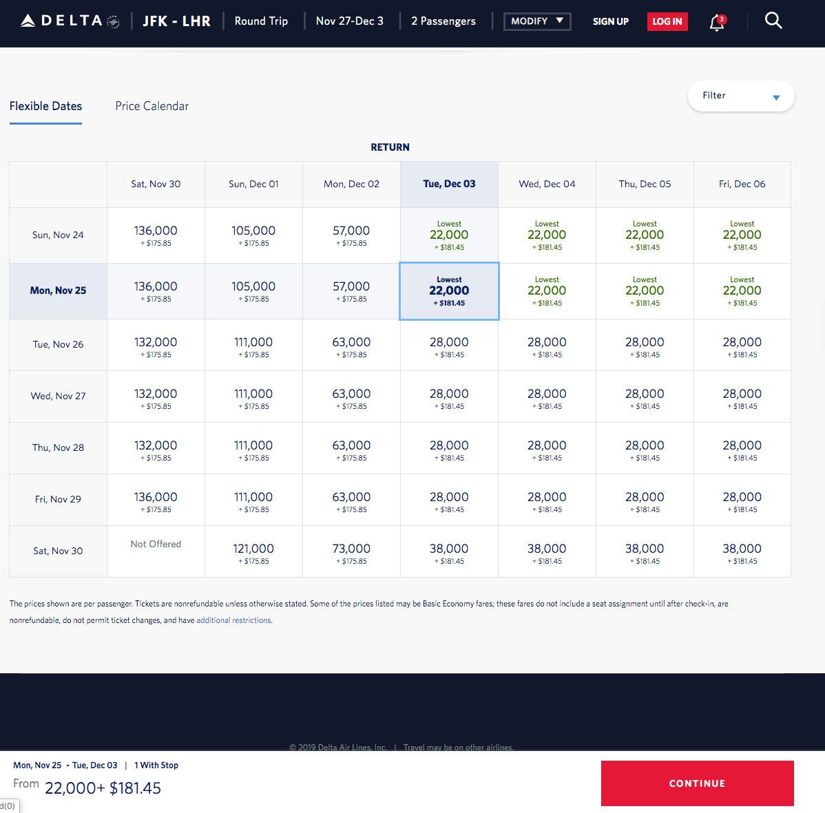 But, you don't have to pay cash for your flights. A Thanksgiving trip could be your chance to get value from Virgin Atlantic Flying Club awards as there's currently availability during that week. It's 10,000 Flying Club miles one-way from JFK to LHR plus $149.20 in taxes and fees. You can drop the taxes and fees to under $100 if you use your Flying Club points to book on Delta instead of Virgin Atlantic. You can transfer American Express Membership Rewards (instant transfer), Chase Ultimate Rewards (instant transfer) and Citi ThankYou Rewards (instant transfer) points to Flying Club at a 1:1 ratio.