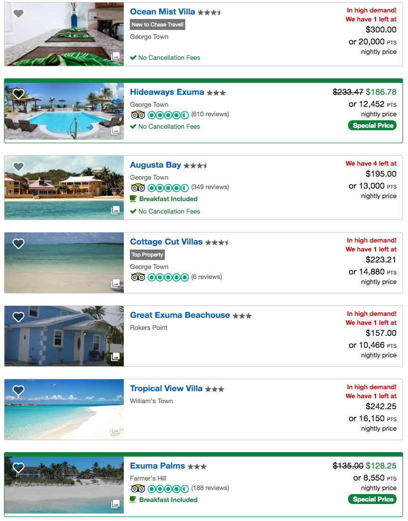 Redeem Chase Ultimate Rewards: Many hotels in the Exumas, including the three I mentioned above, can be booked through Chase travel portal. (See the screen shot below for even more options.) Pay cash and earn points -- at a rate as high as 1.5 cents per point if you have the Chase Sapphire Reserve -- or use your Ultimate Rewards points to redeem for nightly stays.