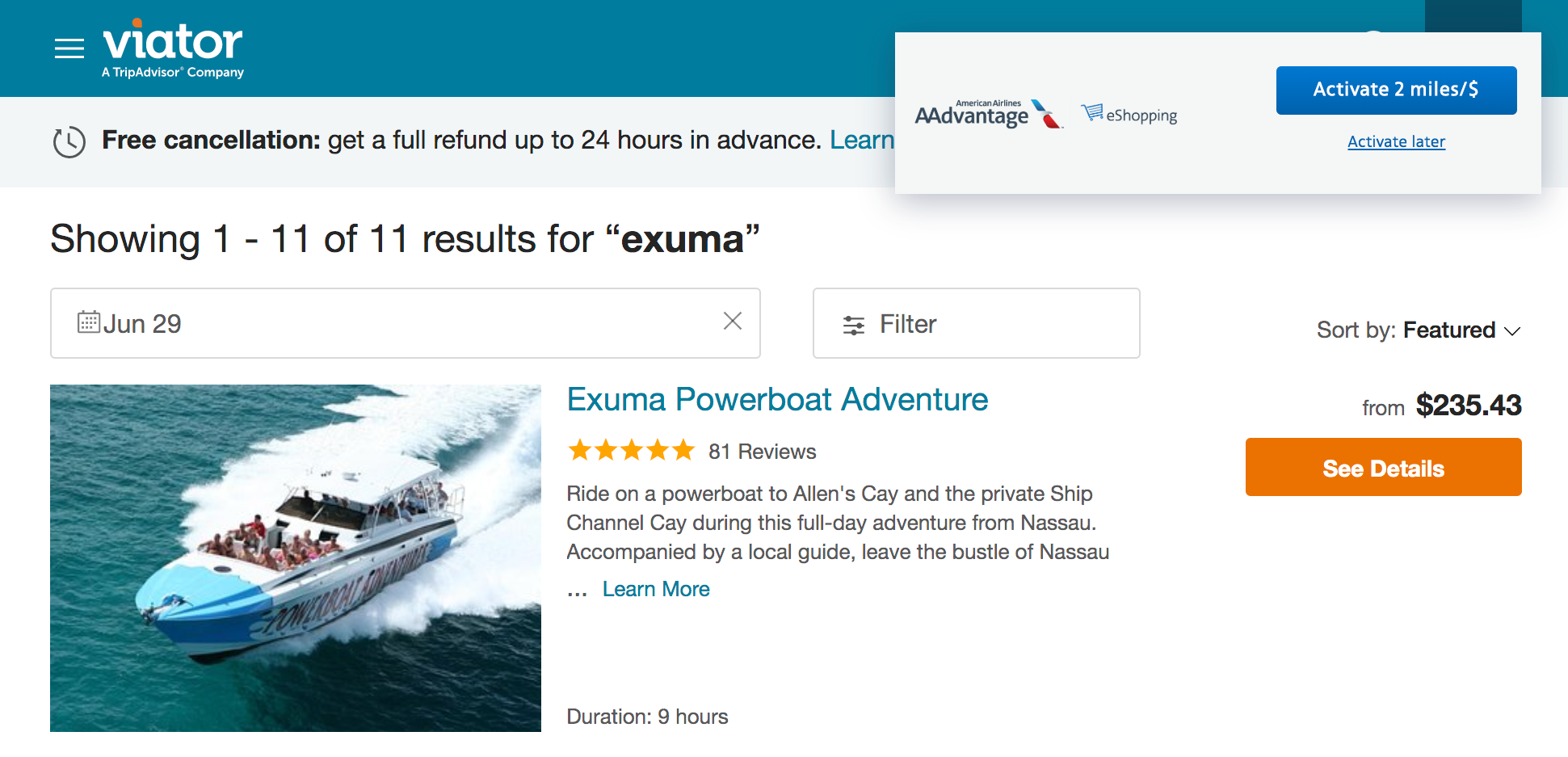 Or, earn 2 American Airlines AAdvantage miles per dollar spent on tours booked through Viator.com