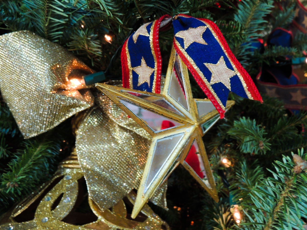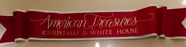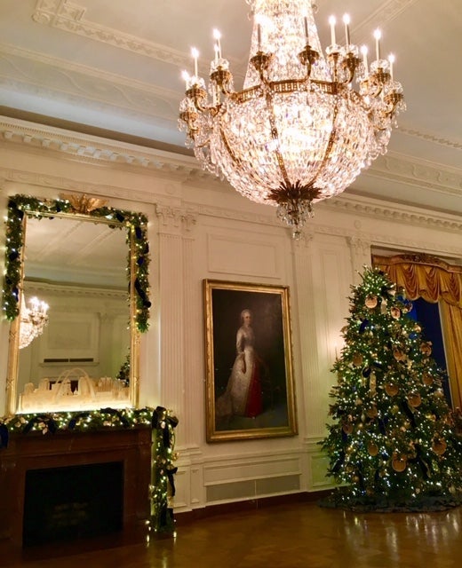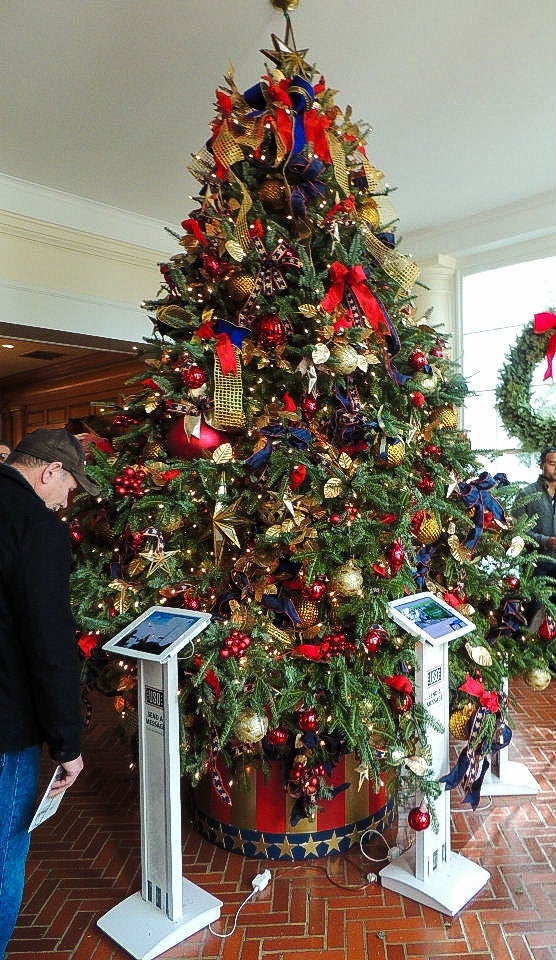 The tour enters from the East Wing, where we passed through a hallway that led to the first of many grand Christmas trees. The initial tree was dedicated to the Gold Star families of our armed forces and was decorated in red and blue ribbons and rich gold ornaments.