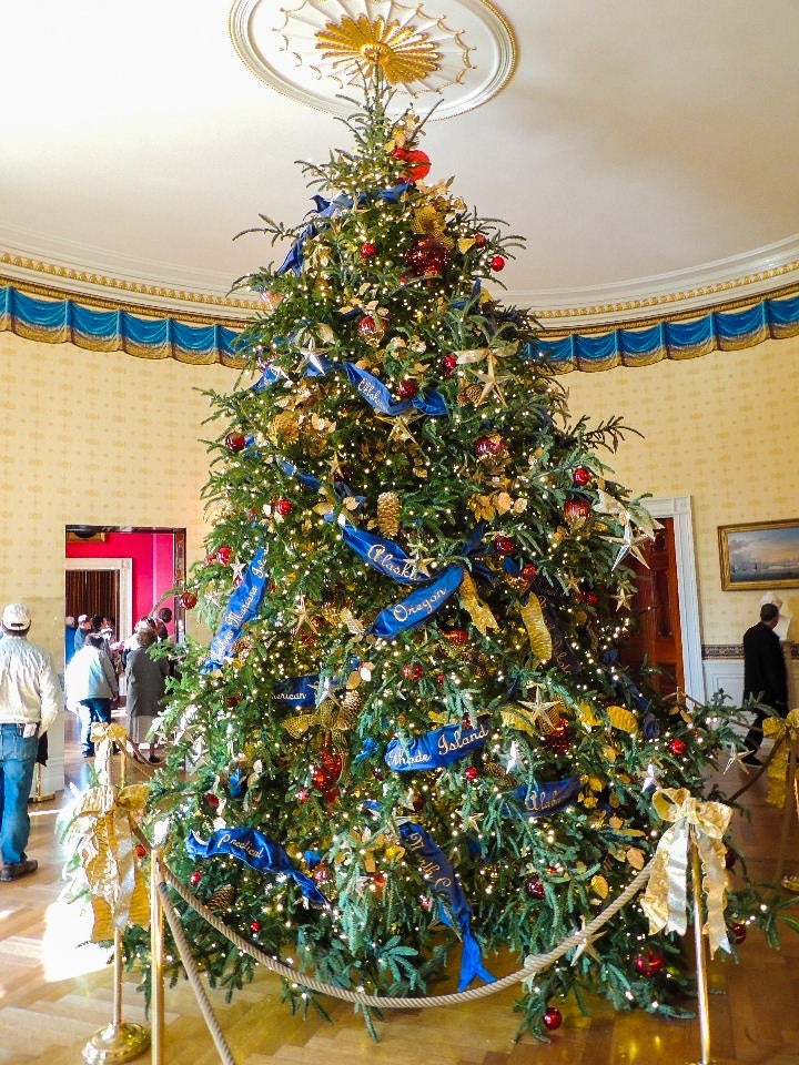The Blue Room just feels like what I think of when I envision the best of America, and the tree there was decorated to enhance this ambience. A long continuous blue velvet ribbon curled itself throughout the tree with the names of all the states and territories proudly embroidered with a rich gold thread. Red and gold ornaments filled the green branches that reached toward and touched the ornate ceiling medallion.