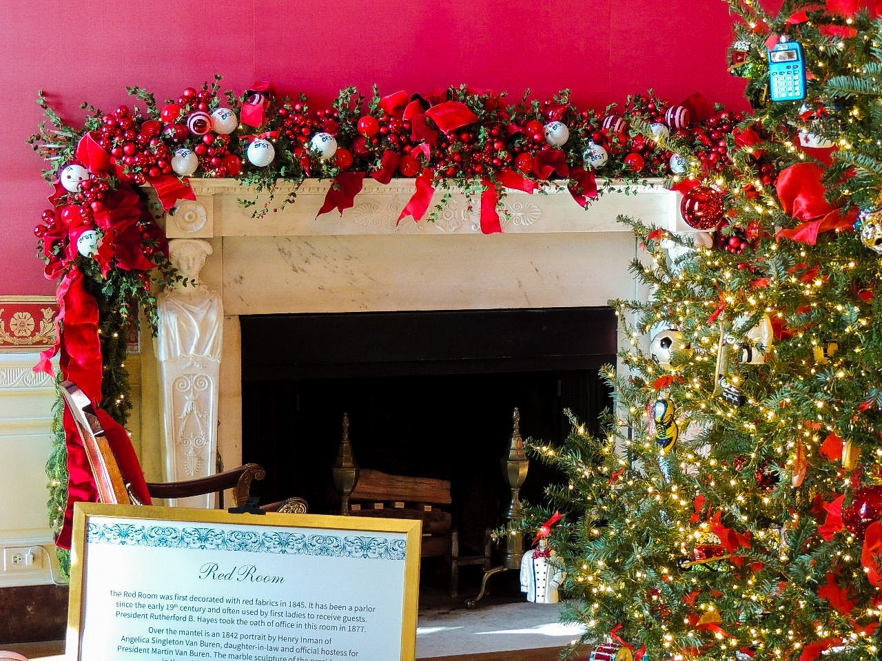 The Red Room's bold color grabs your total attention as you enter its doorway. The centerpiece tree was adorned with ornaments depicting popular activities of American youth ranging from sports to drama to music. The contrast of the white Italian marble fireplace and mantle with the red, green and white garland spray was simply stunning and, in keeping with the spirit of the tree, fun.